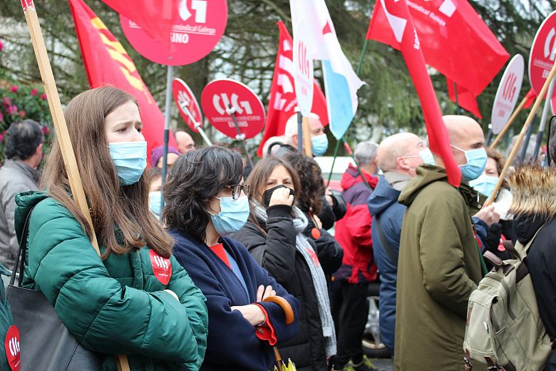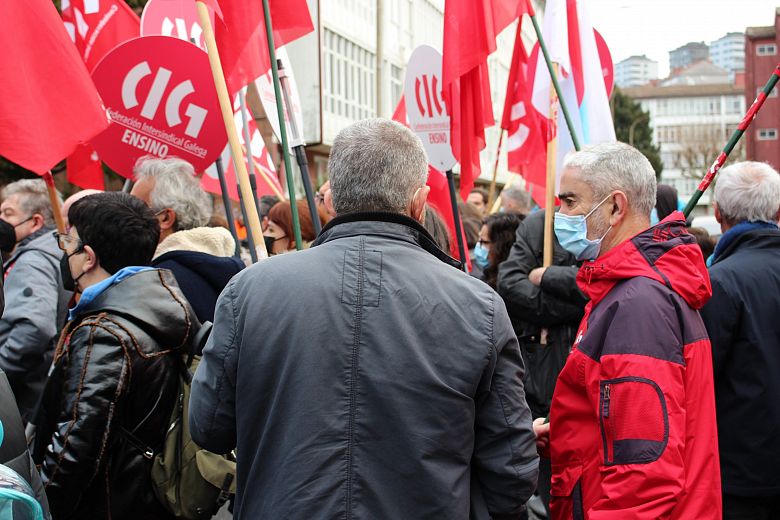 Delegadas e delegados da CIG-Ensino concentráronse esta mañá diante da consellaría de Educación para solicitar a cobertura de todas as baixas nos centros educativos. Denuncian que se están borrando, de media, máis de 20 baixas diarias, solicitadas polos centros educativos, o que leva ao secretario nacional, Suso Bermello, a concluír que “para a Consellaría de Cultura, Educación e Universidade o ensino galego xa superou a Covid, ao menos iso é o que demostra nos chamamentos para cubrir as baixas do profesorado dos centros galego”.