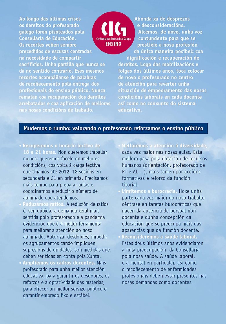 Desde o sindicato maioritario do ensino público en Galiza álzase a voz cunha mensaxe clara e concisa: “abonda xa de desprezos e desconsideracións, sexamos contundentes para que se prestixie a nosa profesión da única maneira posíbel: coa dignificación e recuperación de dereitos”. A CIG-Ensino insiste en que toca colocar de novo o profesorado no centro de atención para reverter unha situación de empeoramento das nosas condicións laborais en cada docente así como no conxunto do sistema educativo.