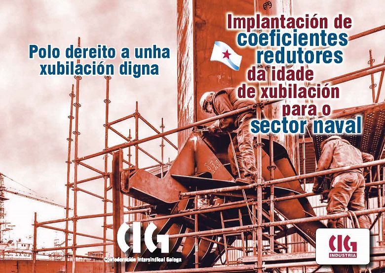 Hai que lembrar que a CIG ten en marcha dende hai meses unha campaña para instar o Ministerio de Traballo e Seguridade Social a que inicie os trámites legais para o establecemento des coeficientes redutores da idade de xubilación para os traballadores e traballadoras do sector naval (tanto nas empresas públicas como nas privadas, así como a industria auxiliar), e poder dar así resposta a unha reivindicación que dende hai tempo se vén debatendo entre o persoal do sector.