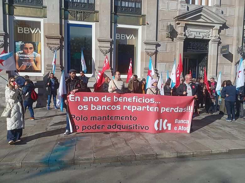 No caso das antigas caixas de aforro, explicou Clodo Montero, secretario da sección sindical da CIG en Abanca, a situación aínda é peor “porque dende o inicio do proceso de reestruturación financeira en 2010 temos practicamente os soldos conxelados, e houbo unha perda en convenio colectivo do 23% á que hai que engadir os recortes introducidos en cada un dos expedientes colectivos aplicados, que no caso de Abanca foron seis”. Rexeitou a proposta patronal na mesa de negociación xa que só ofrece un aumento do 5% en tres anos.