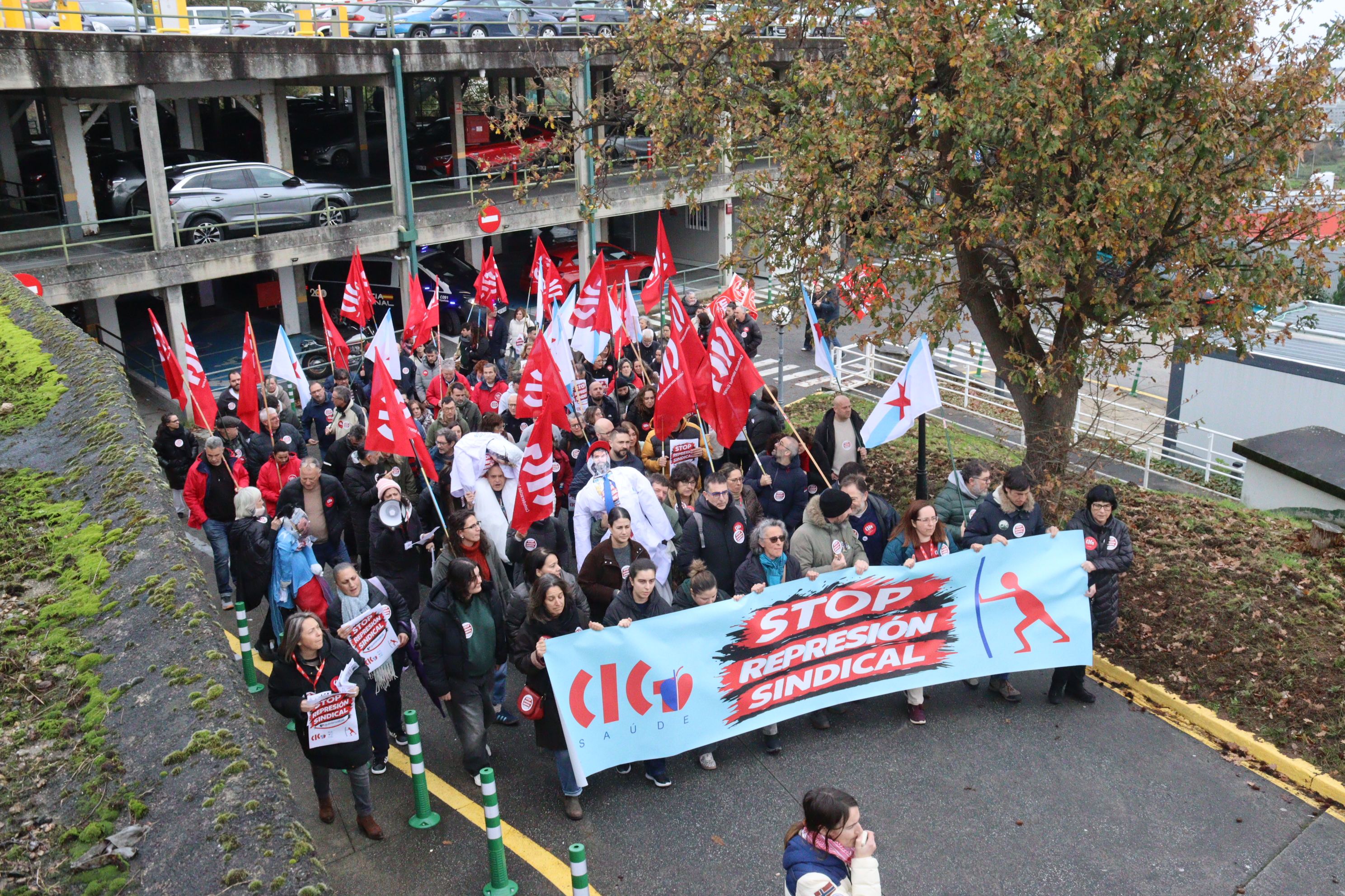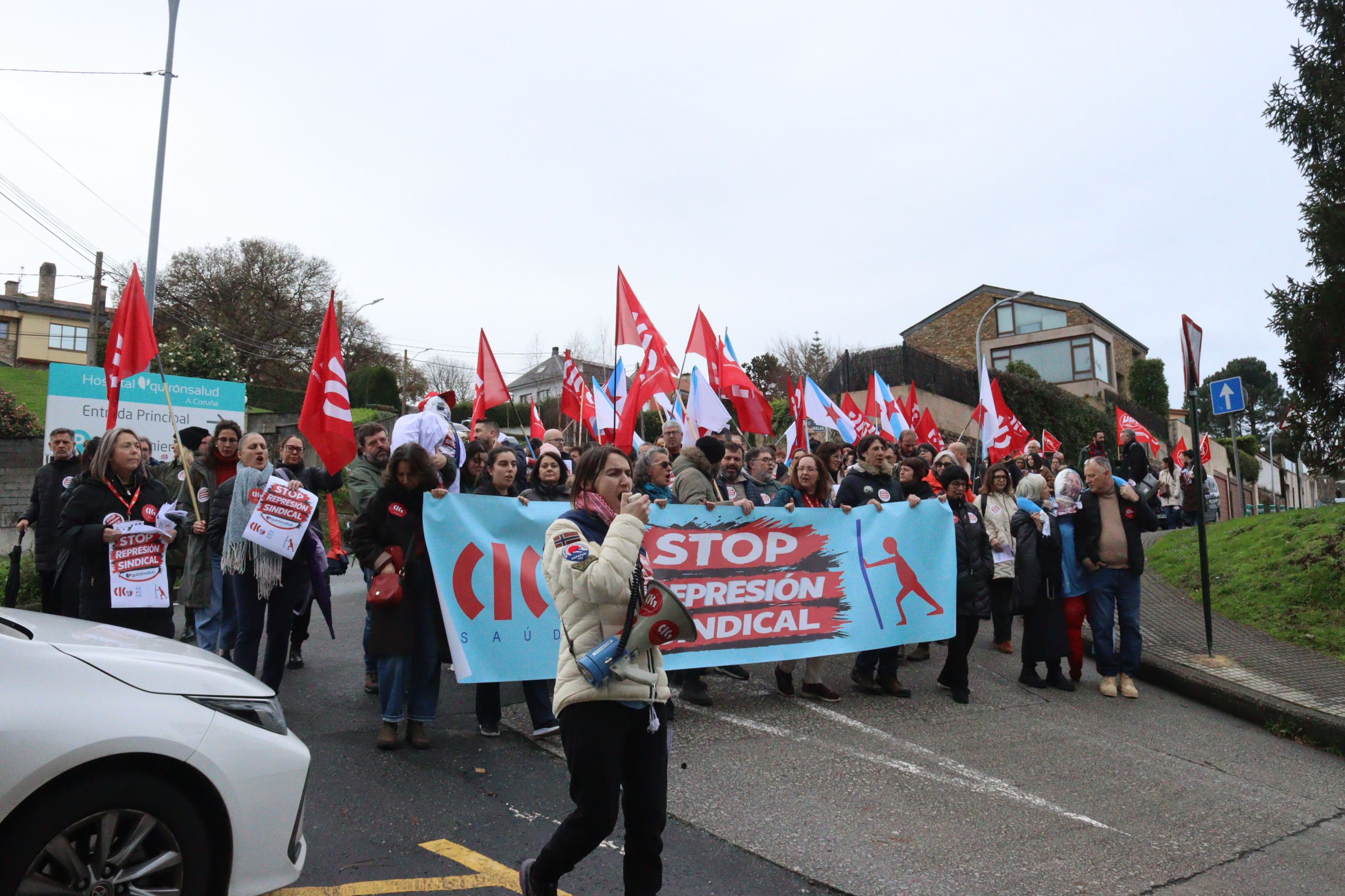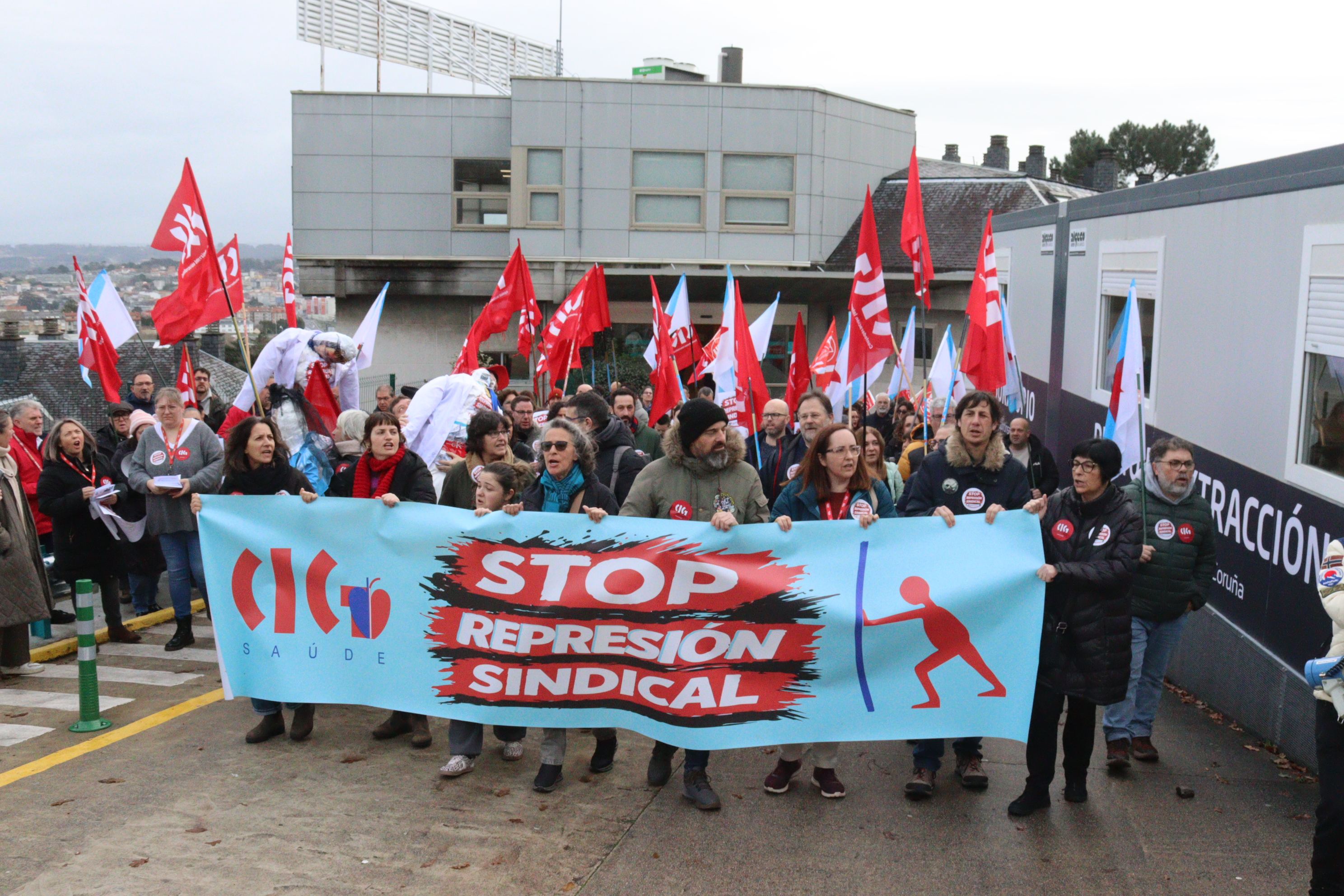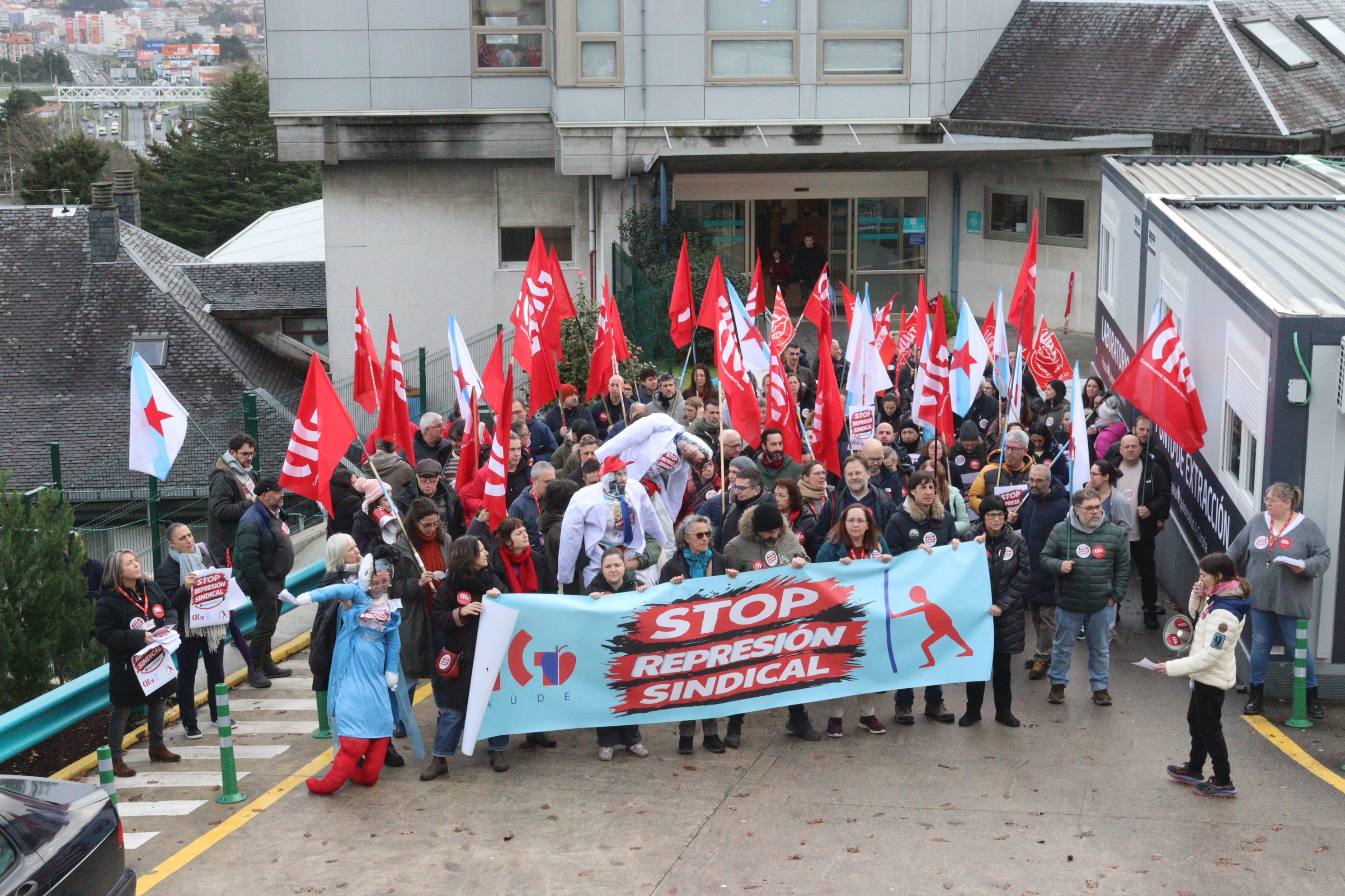 Delegados e delegadas da CIG e persoal do Policlínico Santa Teresa da Coruña mobilizáronse este xoves no centro sanitario para rexeitar a política de represión sindical exercida por QuirónSalud. A persecución á representación da CIG ten a súa máis grave e recente expresión na sanción imposta á presidenta do comité e na sanción con despedimento disciplinario aplicada ao secretario, cando se atopaba ademais en situación de baixa médica.