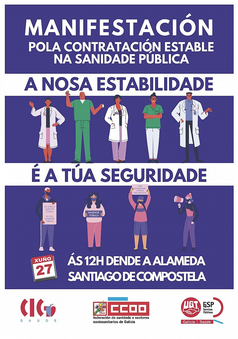 A CIG-Saúde fai un chamamento a todo o persoal do SERGAS e a toda a cidadanía galega a participar na manifestación convocada para este sábado, 27 de xuño, baixo o lema "A nosa estabilidade é a túa seguridade", que sairá ás 12 horas dende a Alameda de Compostela. A marcha está convocada polas organizacións sindicais con representación na Mesa Sectorial (CIG-Saúde, CCOO e UGT), conxuntamente co todos os colectivos de persoal do SERGAS, e ten por obxectivo esixir unha contratación estábel na sanidade pública que remate coa precariedade laboral, así como dotar o sistema dos traballadores e das traballadoras necesarias para atender a demanda asistencial.