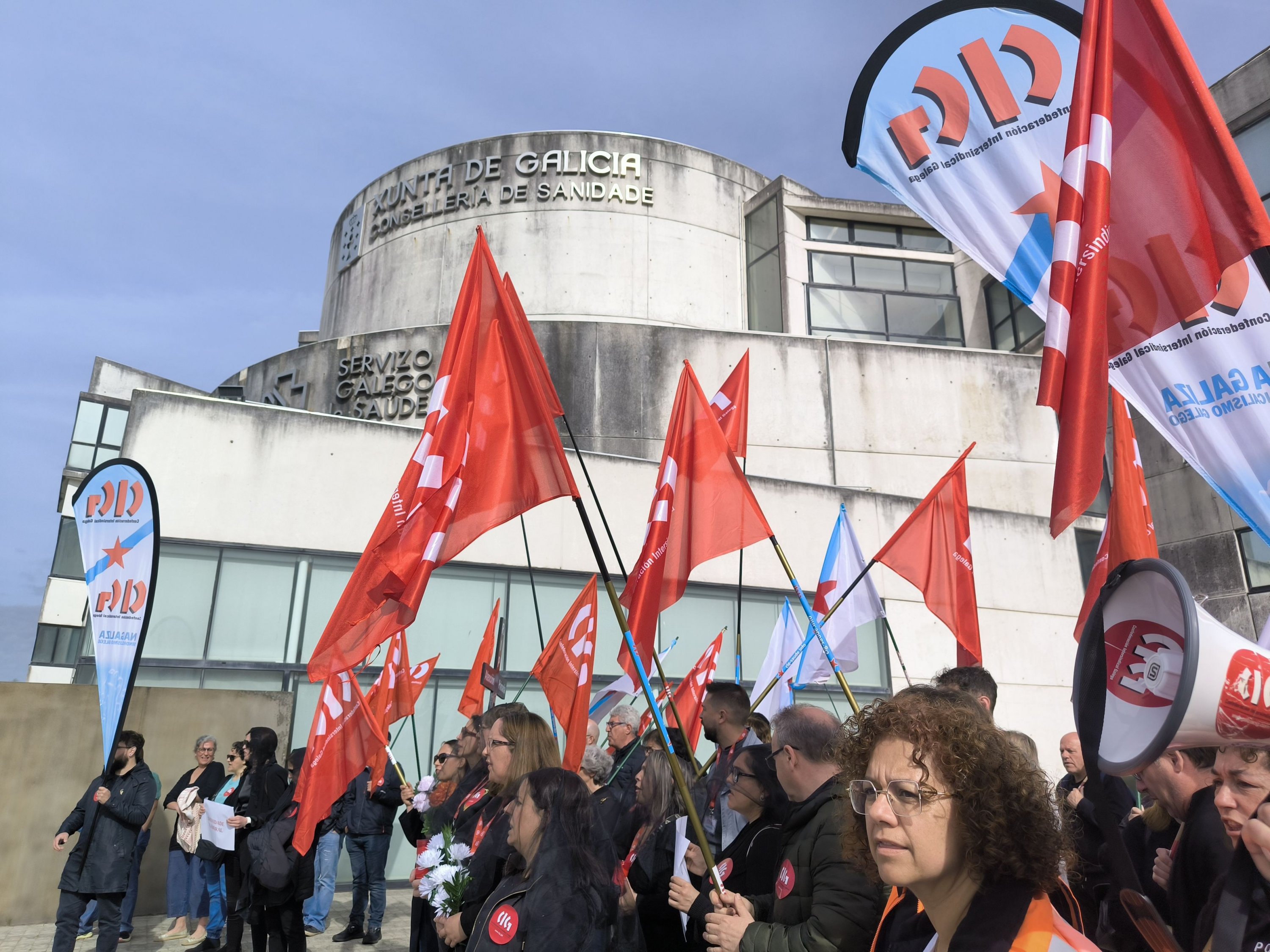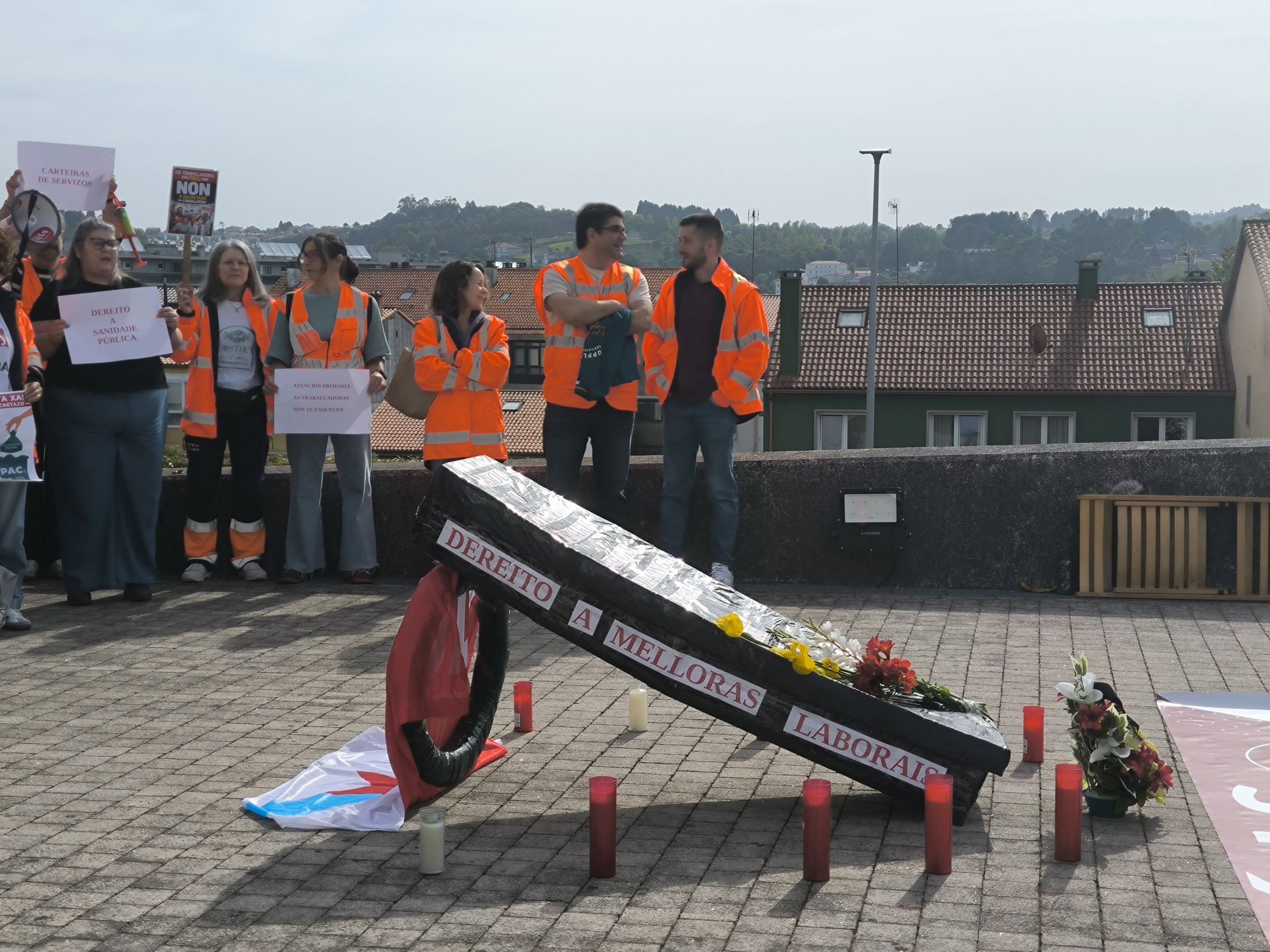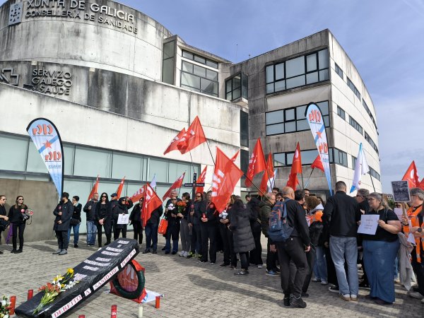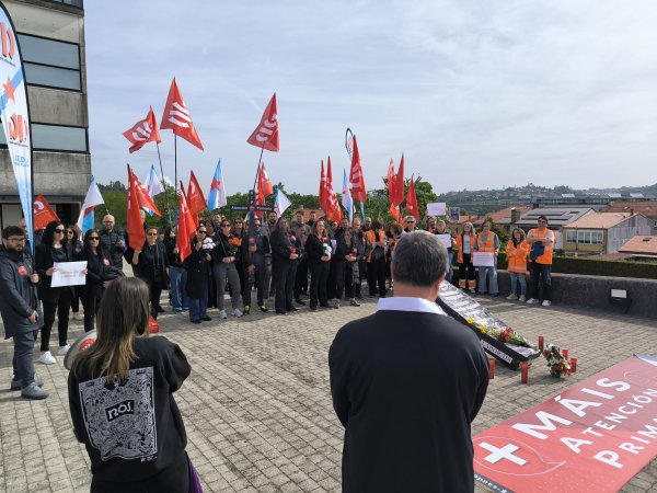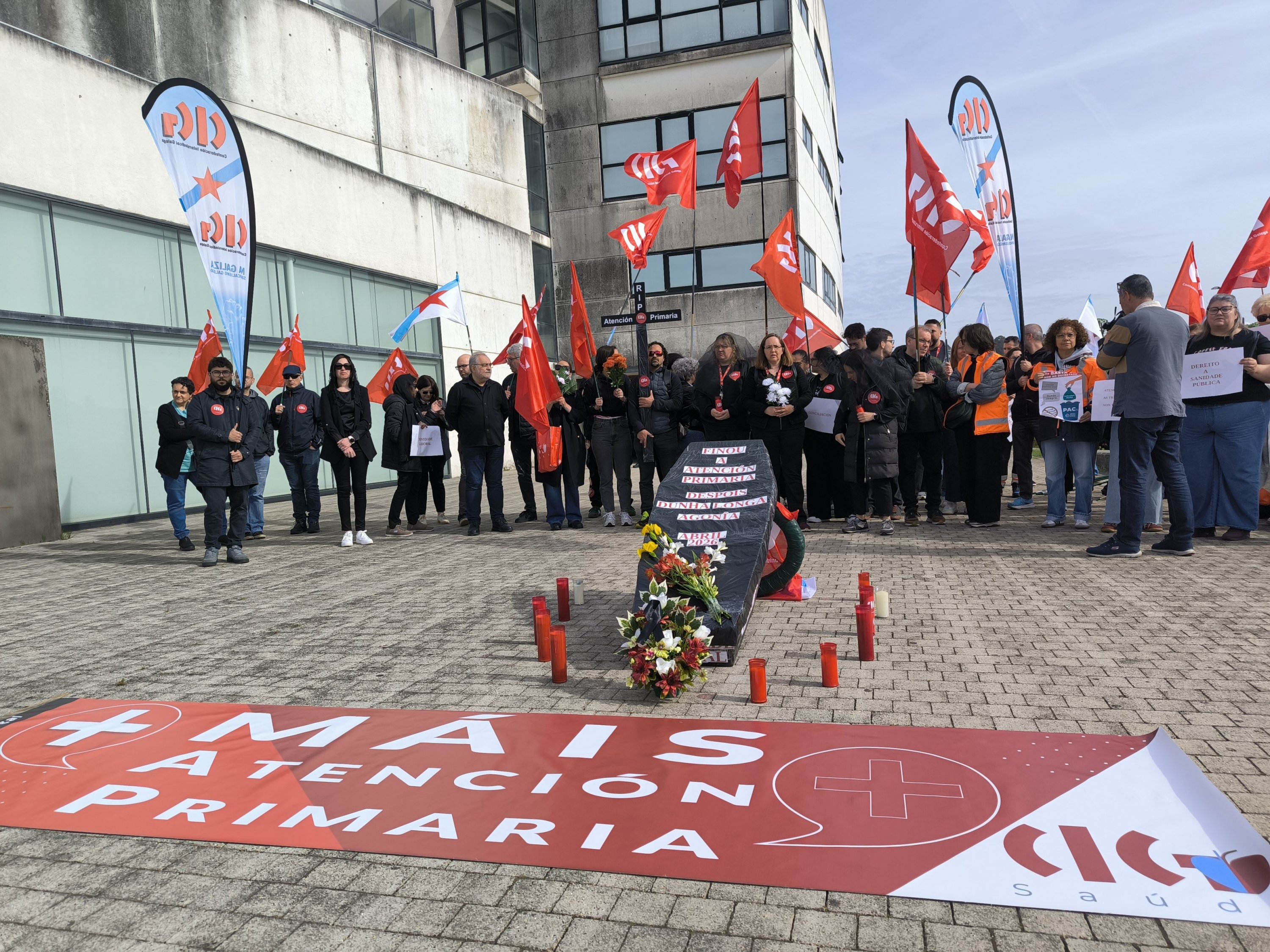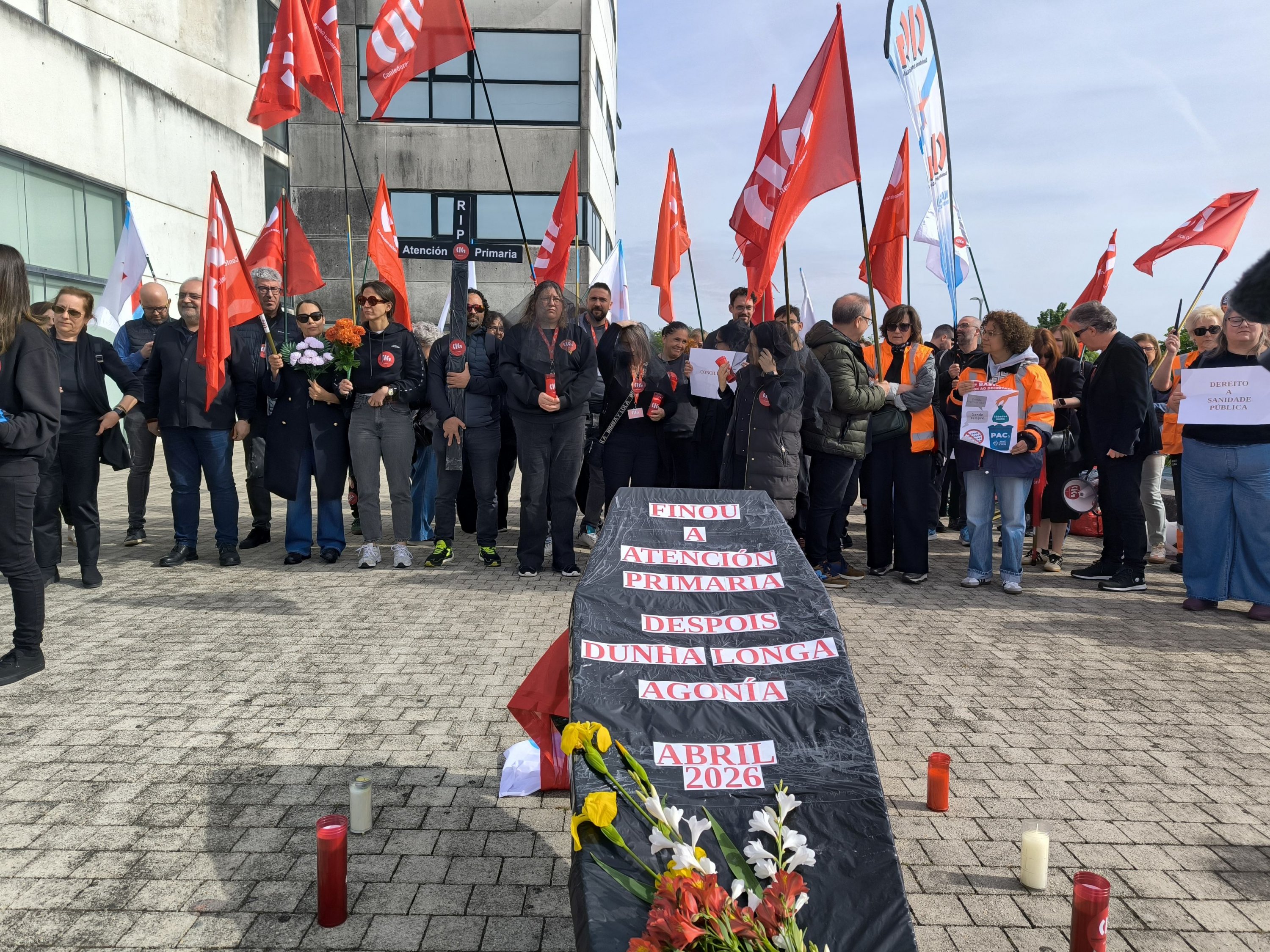 “A Atención Primaria finou despois dunha longa agonía”. Come este epitafio, e coa compaña de ramos de flores, prantos e mesmo pregarias, a CIG-Saúde representou este xoves o enterro da Atención Primaria ás portas da Consellaría de Sanidade. Unha acción enmarcada na nova xornada de folga (a sétima convocada pola central nacionalista dende o mes de novembro) para reclamar melloras nas condicións de traballo e medidas estruturais que eviten o colapso dos centros de saúde e dos PAC.