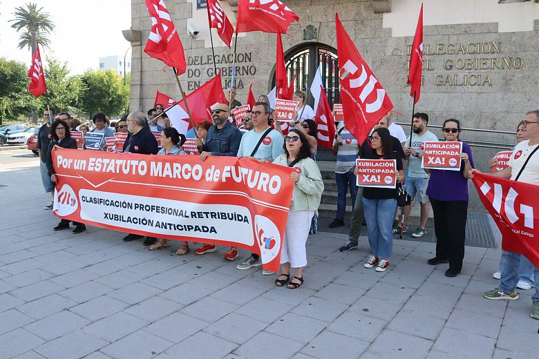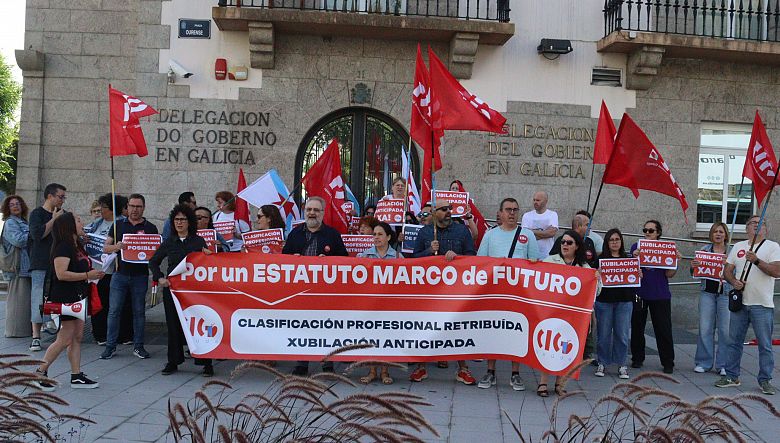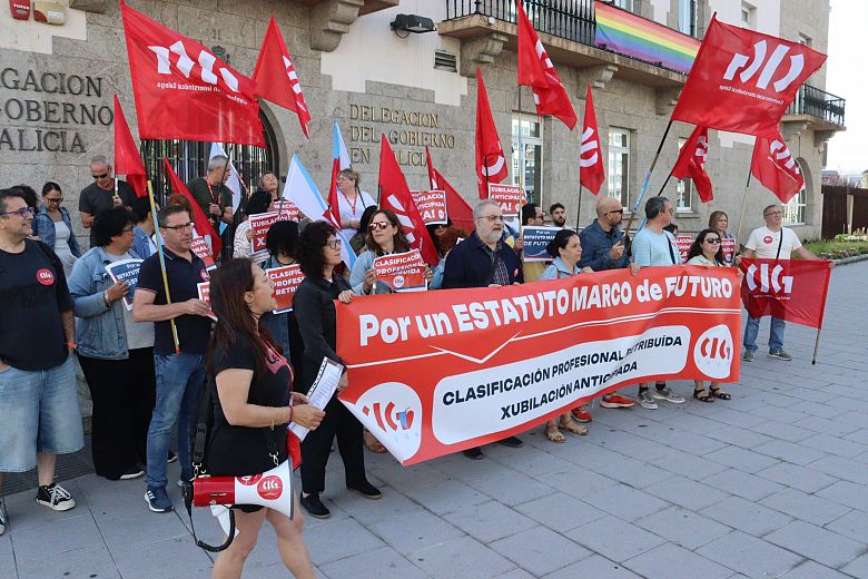 Delegadas e delegados da CIG-Saúde concentráronse este xoves diante da Delegación do Goberno en Galiza en demanda dun Estatuto Marco que responda ás necesidades actuais e futuras da sanidade pública e das persoas que traballan nela. A CIG-Saúde, como organización presente na mesa de negociación, advertiu que non apoiará unha reforma “que lexitime a precariedade” e demanda que o novo texto recolla unha clasificación profesional xusta con retribucións dignas, o recoñecemento do dereito á xubilación anticipada e parcial para o persoal da sanidade e a xornada laboral máxima de 35 horas á semana.