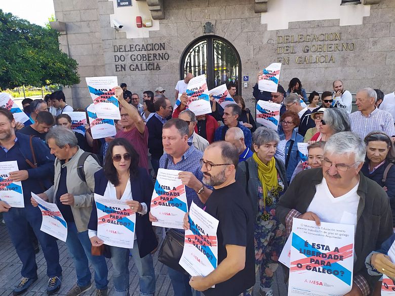 A Delegación do Goberno da Coruña acolleu esta mañá unha concentración, convocada pola Mesa pola Normalización Lingüística baixo o lema “Liberdade para o galego”, para denunciar que o Ministerio de Educación “nega o mínimo recoñecemento do galego”, ao excluír dos Premios Arquímedes os traballos de fin de grao que foran presentados en calquera lingua oficial do Estado, diferente do castelán.