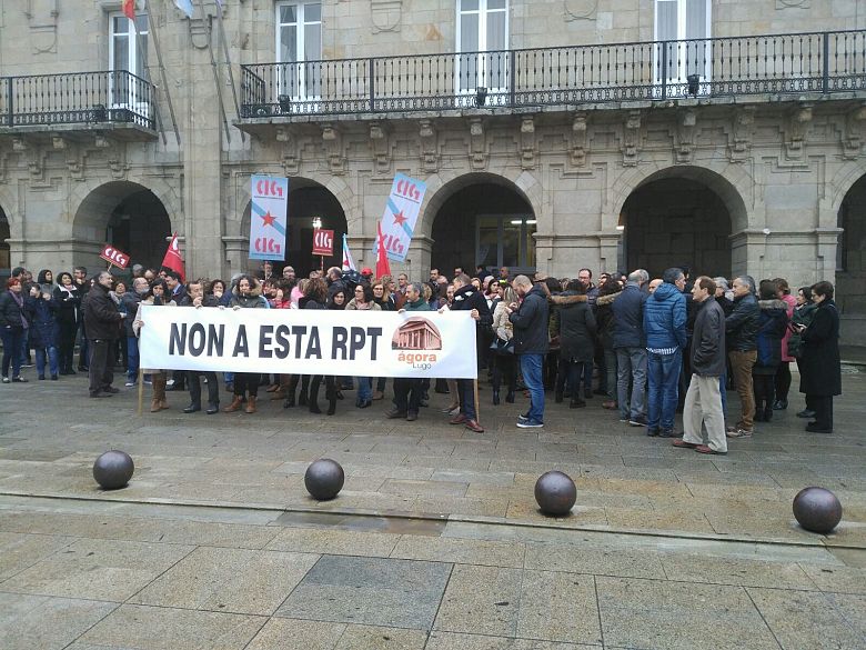 A Sección Sindical da CIG no Concello de Lugo mobilizouse este mércores ás portas da Casa Consistorial en rexeitamento á Relación de Postos de Traballo que vén de ser aprobada e que a CIG non asinou porque, entre outras cuestións, non inclúe os informes de Intervención e Persoal perceptivos e non aparece por escrito o "Valor Punto", un factor determinante para estabelecer as contías contributivas dos empregos.