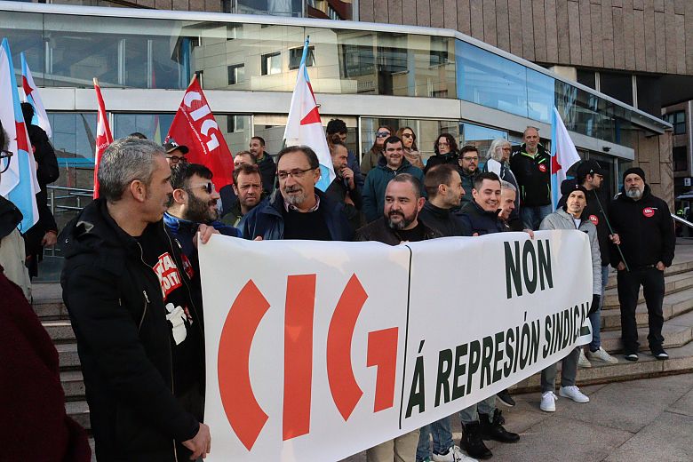 Delegadas e delegados da CIG concentráronse esta mañá diante dos xulgados da Coruña en rexeitamento á represión sindical e en solidariedade co traballador do metal que está sendo xulgado pola súa participación nas mobilizacións que o sector realizou en 2022 en defensa dun convenio colectivo digno.