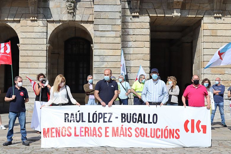Condutores da liña Santiago aeroporto concentráronse esta mañá diante do concello de Santiago, na praza do Obradoiro, para reclamar do goberno municipal, e nomeadamente do seu alcalde, Xosé Sánchez Bugallo, unha solución inmediata á súa situación. Denunciaron ademais que malia o compromiso adquirido por unanimidade no pleno municipal nada saben das xestións que Bugallo se comprometeu a facer e acusárono de actuar ao ditado de Monbus.