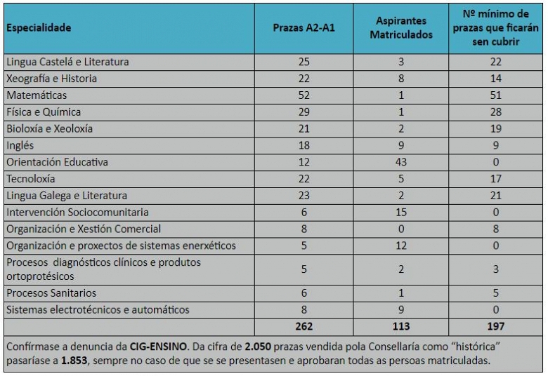 A CIG-Ensino presentou un estudo no que desmontaba esas cifras, alertando de que o número de prazas para o acceso desde o grupo A2 (corpos de mestres e de profesorado técnico de FP) ao corpo de PES estaba totalmente descompensada ao respecto da evolución da demanda destes últimos anos. Para o sindicato, esa decisión de inflar de xeito desproporcionado estas prazas só podía corresponder a unha estratexia da Consellaría para vender unha oferta de prazas maior da realizada.