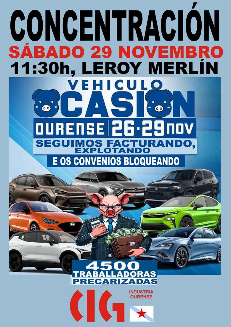 Por outra banda, dende a CIG-Industria de Ourense anuncian a convocatoria dunha protesta este sábado 29 de novembro coincidindo coa celebración dun salón de vehículos de ocasión organizado polo Grupo Pérez Rumbao. Na concentración, que terá lugar nas inmediacións do establecemento de Leroy Merlín ás 11:30 horas, participarán tamén persoas traballadoras do sector do siderometal para reclamar un convenio colectivo provincial digno.