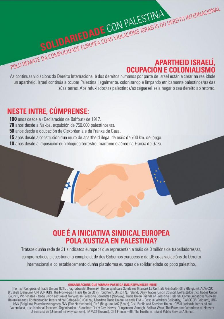 Como sindicalistas europeas e europeos, estamos abraiados/as de que, a pesar desta clara inxustiza inflixida ao pobo de Palestina, os Estados europeos, a Unión Europea (UE) e as institucións representativas non cumpran co seu deber de responsabilizar a Israel das súas graves violacións do dereito internacional e dos dereitos humanos. A UE e as corporacións multinacionais obteñen beneficios, ao facilitar a continua represión e encarceramento da poboación palestina.