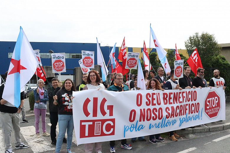 Delegados e delegadas da CIG no sector das TIC concentráronse este xoves diante da sede de Indra na Coruña en defensa dun convenio de consultorías digno e con melloras salariais reais. En Galiza hai arredor de 25.000 traballadores e traballadoras reguladas por este convenio de ámbito estatal que, malia os enormes beneficios que están obtendo as empresas, segue contendo táboas salariais no límite do SMI.