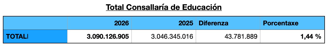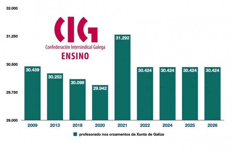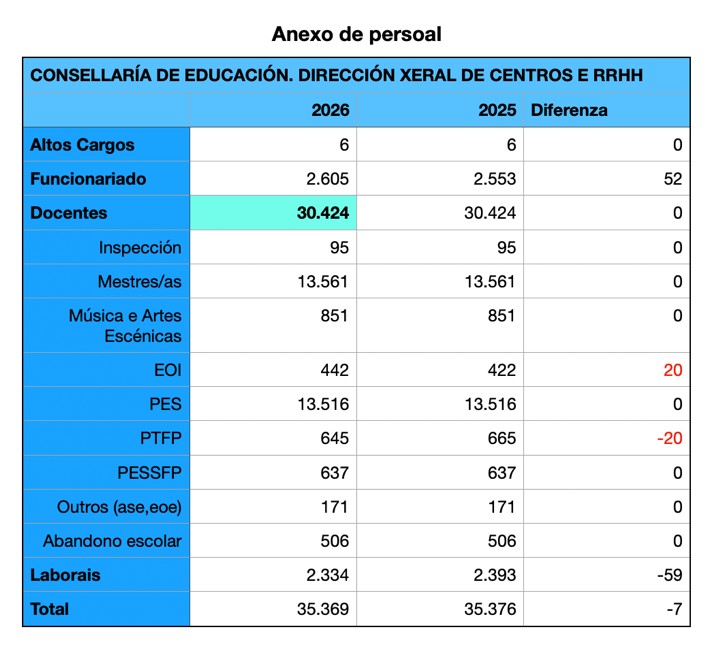 Os orzamentos da Consellaría de Educación para 2026 manteñen unha liña continuista e a cifra de docentes volve situarse inalterábel dende 2022, en 30.424 efectivos, e incremento no gasto en persoal débese sobre todo á asunción das cotizacións á Seguridade Social das novas contratacións, dado que o persoas que se xubila é de clases pasivas e este gasto asumíao o Estado.