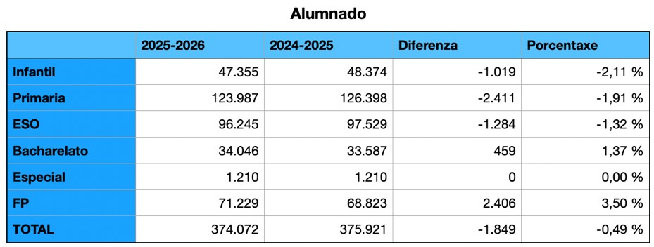 Con todo, para Arroxo o máis rechamante é que segue orzamentado o mesmo número de docentes, 30.424, que os últimos catro anos, desde 2022 tras a pandemia na que si se reforzara o persoal docente.