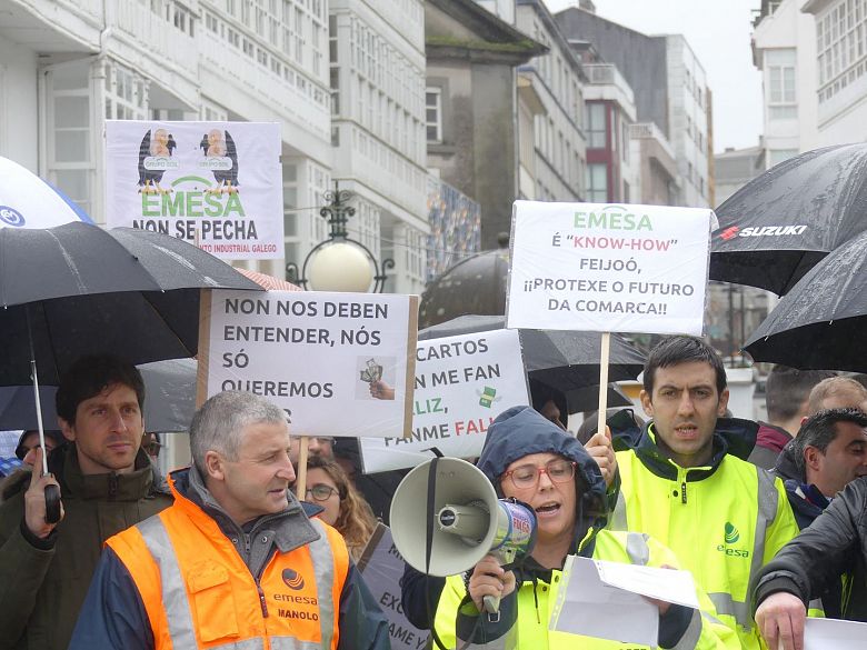 Traballadores e traballadoras de Elaborados Metálicos EMESA iniciaron este venres o calendario de mobilizacións en defensa do emprego e da actividade produtiva e para esixir o cobro dos salarios. Ao berro de "EMESA non se pecha" e botándolle unhas coplas, o persoal realizou unha concentración na Praza Irmáns García de Betanzos para denunciar a situación do Grupo Soil Recovery (propietario das instalacións), que solicitou concurso de acredores despois dunha nefasta xestión, e advertir do impacto económico e laboral que tería sobre a comarca permitir o desmantelamento dunha industria con 62 anos de historia.