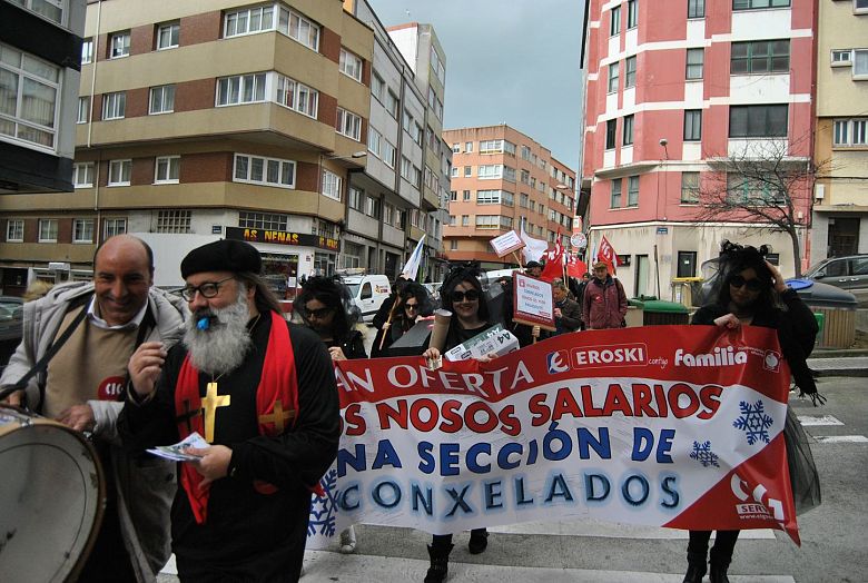 Persoal de Eroski-Familia realizou este mércores un peculiar "enterro dos salarios" na Coruña para denunciar que levan cinco anos cos soldos conxelados, a pesar de que neste período a empresa incrementou os seus beneficios un 300%.
