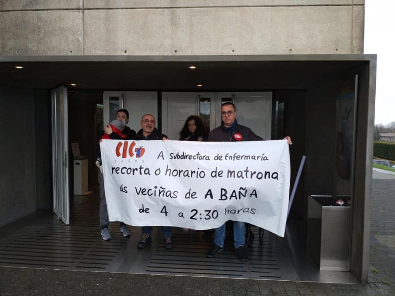 Algo semellante ocorre na Baña, onde un cento de persoas se concentraron o pasado sábado diante do centro de saúde, convocadas pola CIG-Saúde, para protestar polo novo horario asistencial que se lle impón desde a Xerencia de Santiago, á matrona. Concentración que se repetirá o vindeiro sábado de 10:00 a 12:30 horas.