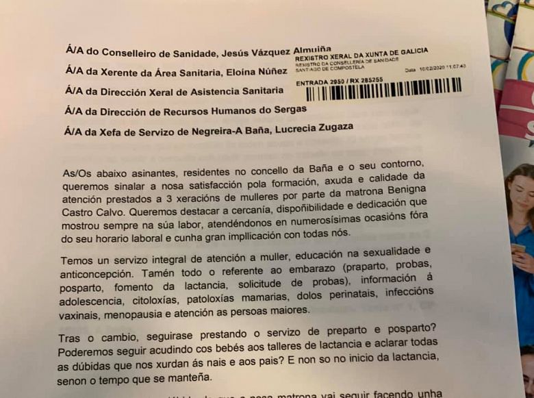 A matrona conta co apoio das mulleres dos concellos de A Baña e de Negreira que nos dous últimos sábados se concentraron diante do centro de saúde e recolleron as sinaturas de apoio que hoxe presentaron en demanda de que o SERGAS manteña o servizo da matrona tal e como se viña desenvolvendo até o de agora.