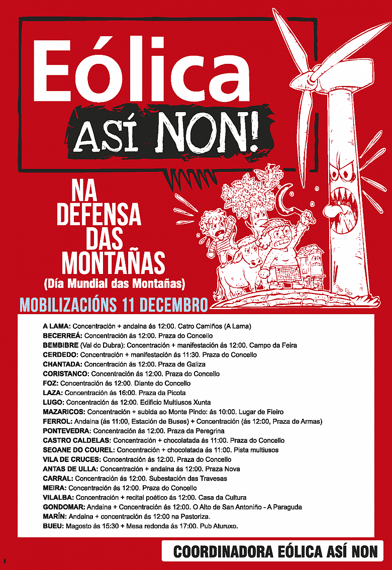 O vindeiro 11 de decembro, Día das Montañas, a coordinadora “Eólica Así Non” promoverá unha mobilización descentralizada por áreas xeográficas especialmente afectadas pola actual vaga eólica, desta volta, co obxectivo de dar especial visibilidade ás plataformas e colectivos da veciñanza que viven nos territorios máis directamente afectados por esta enxurrada incesante de proxectos eólicos.