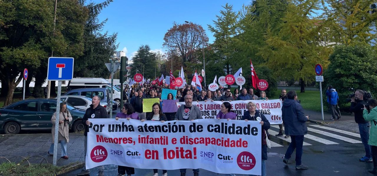 A marcha, na que se estima unha participación superior ao milleiro de persoas, rodeou o edificio administrativo de San Caetano e transcorreu baixo consignas como “traballo feminizado, traballo precarizado”, “convenio galego, salarios dignos” ou “menos discursos e máis recursos” en alusión esta última á conselleira de Política Social que ten as competencias para xestionar estes tres servizos, a maioría deles xestionados por asociacións sen ánimo de lucro en réxime de concerto social.
