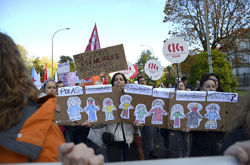Pola súa banda, na lectura final do manifesto, Lucía Barros, delegada da CIG na Escola Infantil Príncipe Felipe de Pontevedra, volveu incidir en que as traballadoras do primeiro ciclo de infantil están consideradas “traballadoras pobres”, con salarios por debaixo do SMI, con ratios inasumíbeis de até 8 menores de un ano por cada traballadora ou até 20 de dous a tres anos, sen horario laboral para preparar as actividades, dado que é todo de atención directa.
