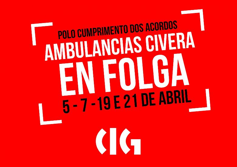 O comité de empresa de Ambulancias Civera (5 delegados/as da CIG), concesionaria do servizo de transporte sanitario programado e de traslados intrahospitalarios das áreas de Pontevedra-O Salnés, anunciou hoxe a convocatoria de catro xornadas de folga para os días 5, 7, 19 e 21 de abril ante os graves incumprimentos da empresa no que ten que ver prego do concurso e coas condicións laborais. No caso de que o Sergas non interveña para solucionar o conflito o paro pasará a ser indefinido a partir do vindeiro 1 de maio.
