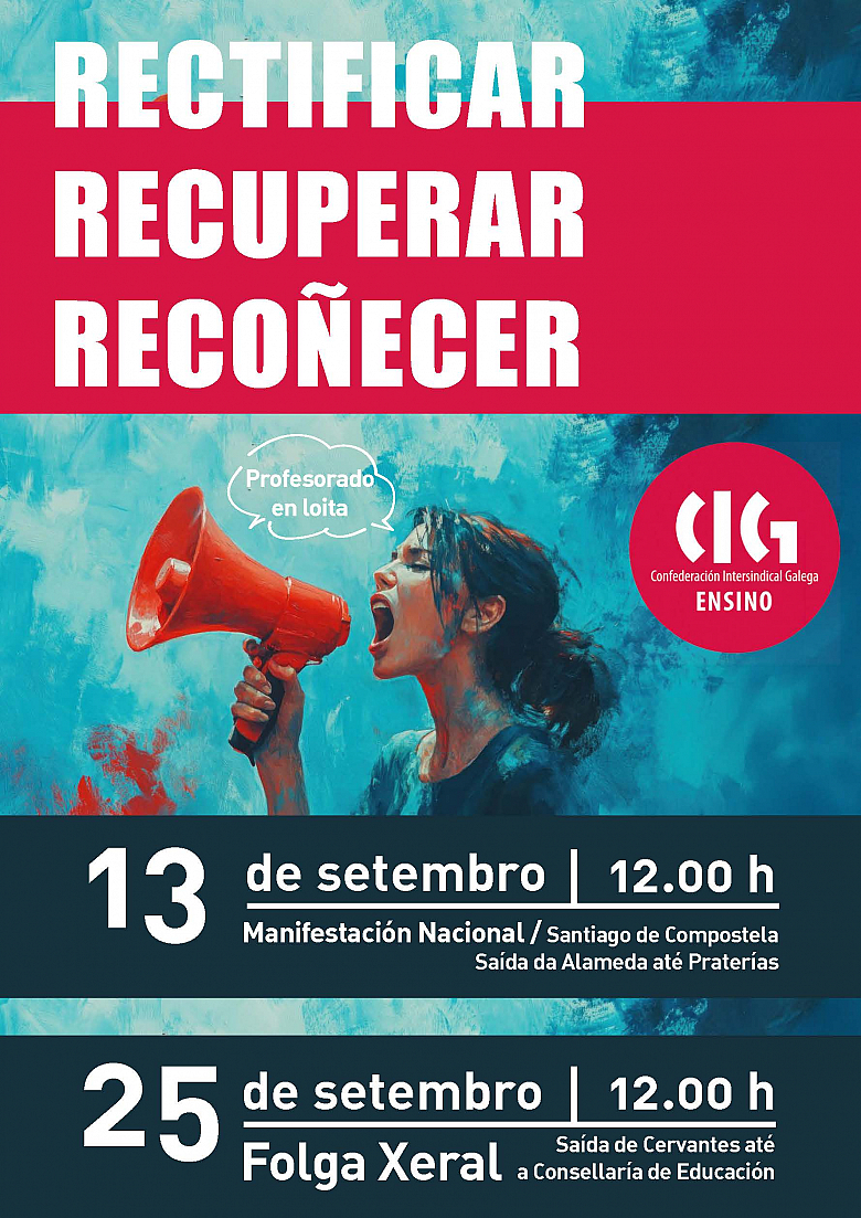 A CIG-Ensino anunciou hoxe a convocatoria dunha xornada de paro o 25 de setembro para rexeitar a política de recortes e a propaganda da Xunta de Galiza. Días antes, o sábado 13, terá lugar unha manifestación para trasladar o “fondo malestar” do profesorado, “que conta coas peores condicións laborais no contexto educativo máis complexo das últimas décadas”. As protestas fan parte da campaña de loita posta en marcha pola central sindical para apelar a Consellaría de Educación a ‘Rectificar, recuperar e recoñecer’ e que anticipa un curso de mobilizacións.