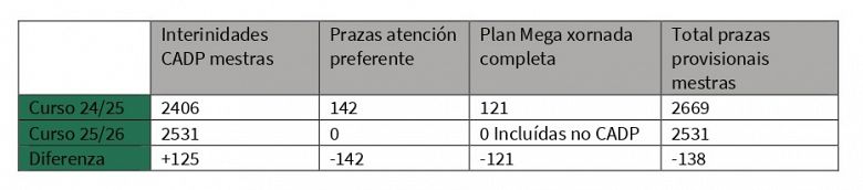 Tamén se ve claramente nas adxudicacións no CADP que este curso hai 138 prazas provisionais menos de mestras de infantil e primaria que o pasado, dado que non se convocaron as 142 prazas de atención preferente de Pedagoxía Terapéutica e Audición e Linguaxe e as vacantes do Plan Mega este curso van incluídas no CADP, tal e como demandou a CIG nos tribunais “mais loxicamente sen que isto significara reducir as interinidades”. Así, Arroxo afirmou categoricamente “queda demostrado con estes datos que os fondos europeos destinados á inclusión educativa están a ser empregados para parchear necesidades estruturais dos centros (desdobres de aulas maioritariamente), ou que é o mesmo, que cando o goberno galego lle plantexou á minoría sindical o “Acordo de Melloras” fíxoo a custe cero sabendo que as poucas medidas que se ían autorizar se financiarían con estas partidas que, insistimos, tiñan que estar destinadas a reforzar a atención á diversidade, non a cubrir unha titoría ordinaria de primaria como está a pasar”.