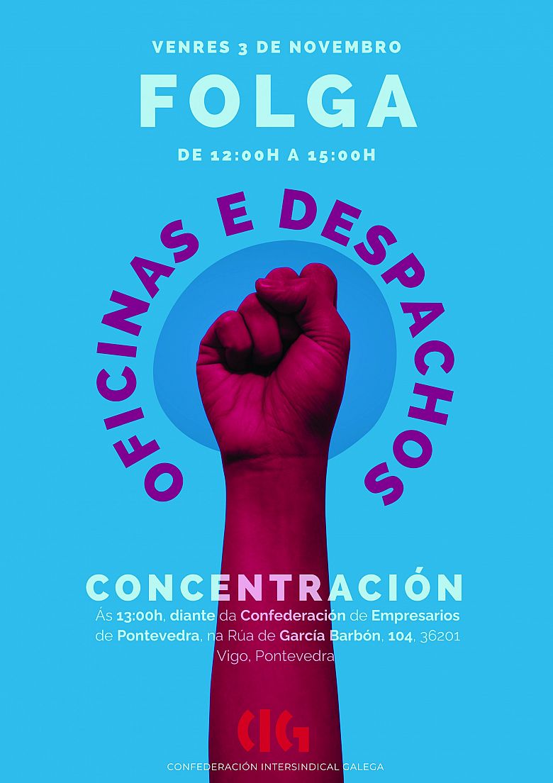 A federación de Banca da CIG anunciou hoxe a convocatoria dun paro parcial de tres horas no sector de oficinas e despachos da provincia de Pontevedra para este venres 3 de novembro para reclamar un convenio colectivo digno tras 11 anos caducado e sen actualización salarial dende 2012. A central sindical aproveitará a xornada para desenvolver unha concentración diante da sede da Confederación de Empresarios en Vigo.