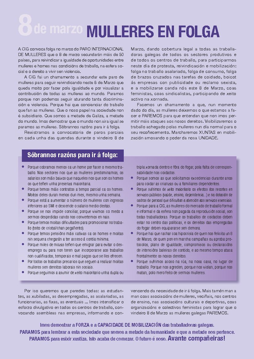 A CIG fai un chamamento a secundar este paro de mulleres para seguir reivindicando neste 8 de Marzo que queda moito por facer pola igualdade e por visualizar a contribución de todas as mulleres ao mundo. Paramos porque non podemos seguir aturando tanta discriminación e violencia. Porque hai que concienciar do traballo que fan as mulleres. Que o noso papel na sociedade non é subsidiario. Que somos a metade de Galiza, a metade do mundo. Imos demostrar que o mundo non xira igual se paramos as mulleres. Sóbrannos razóns para ir á folga.