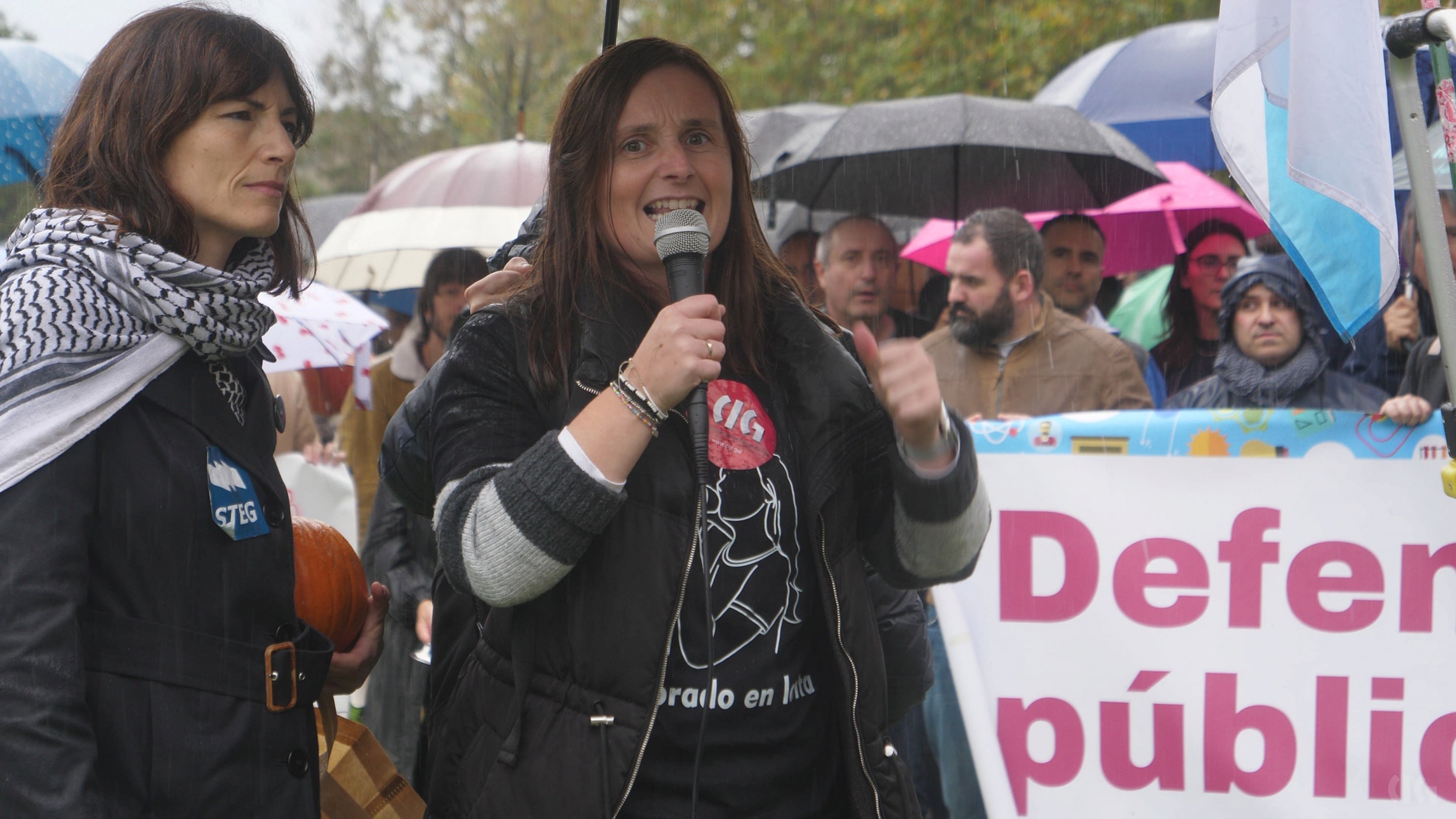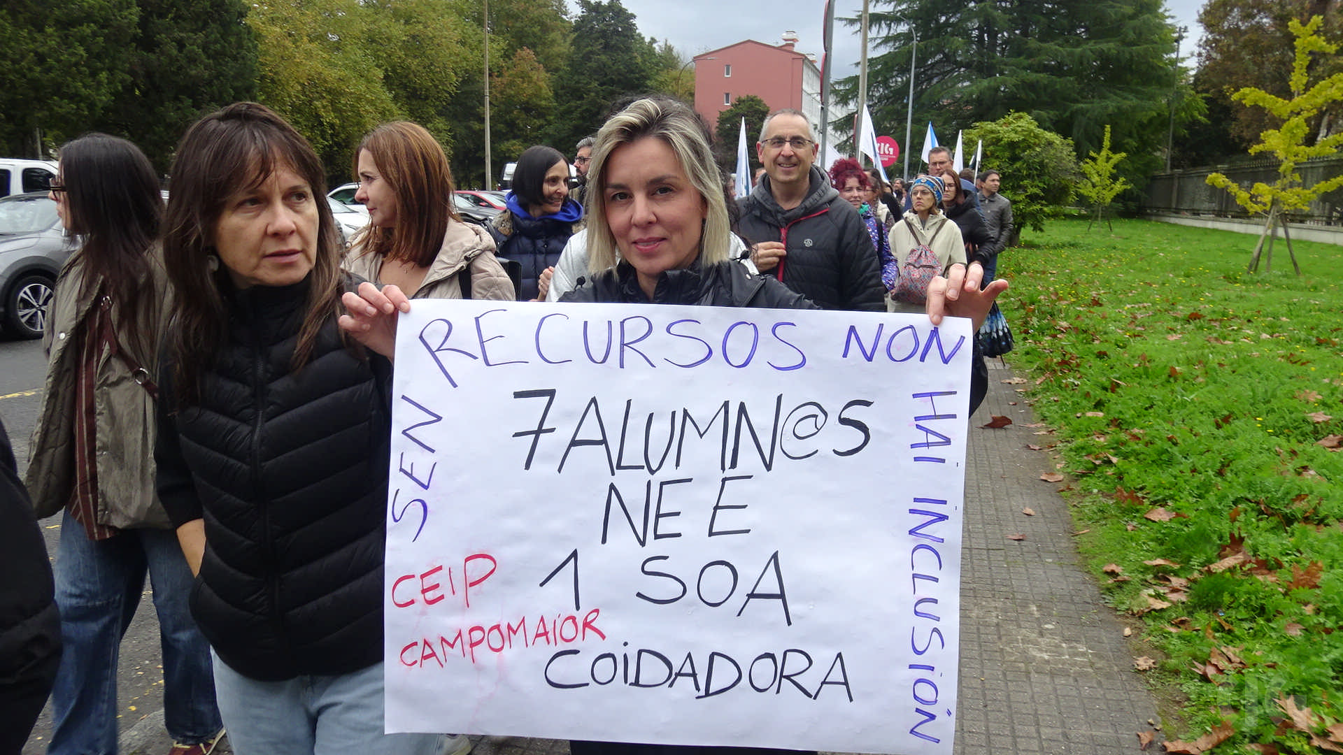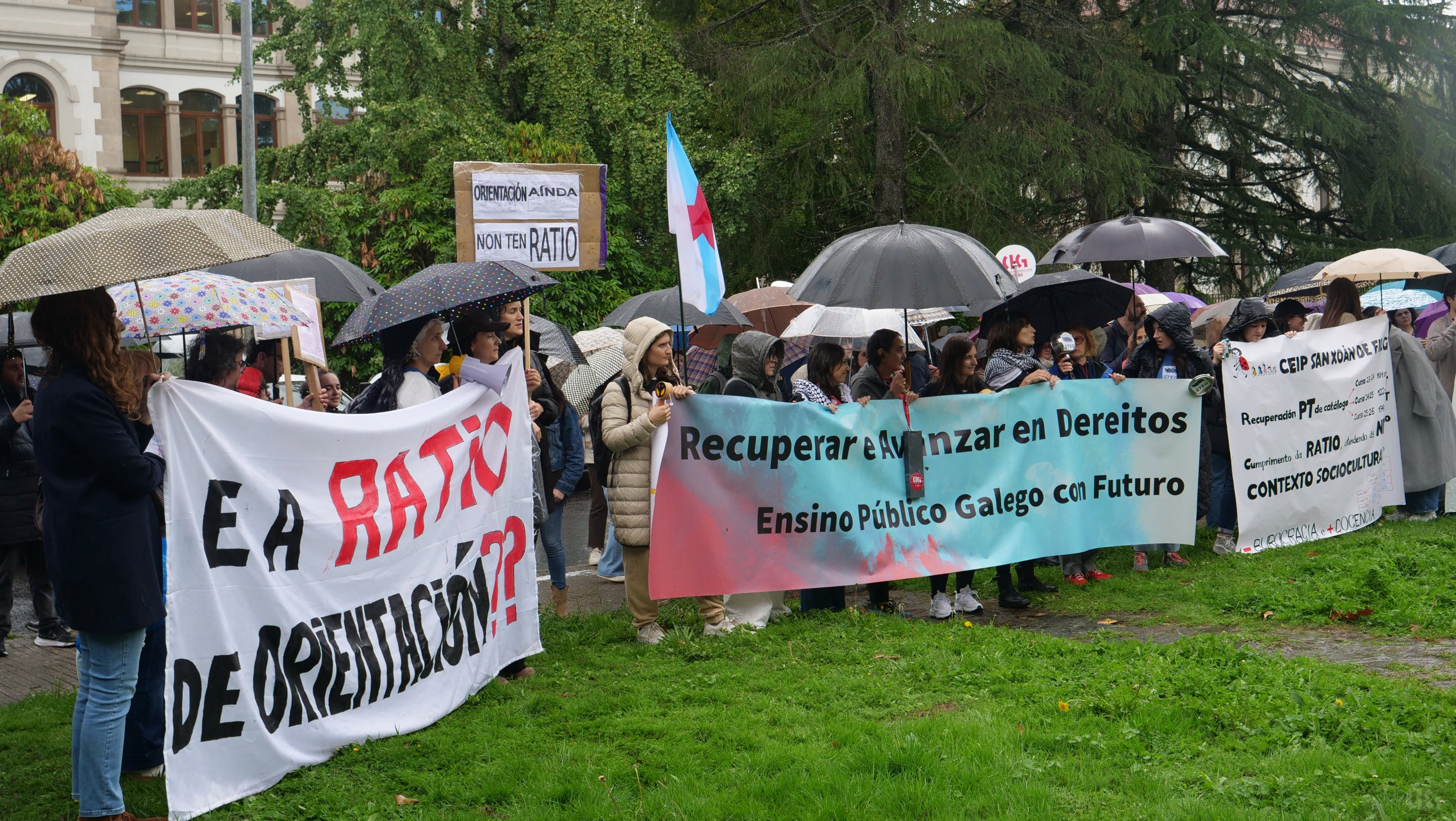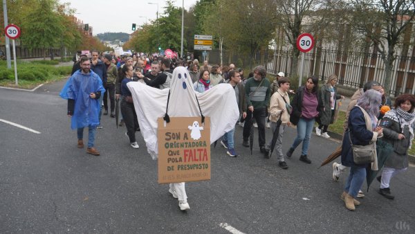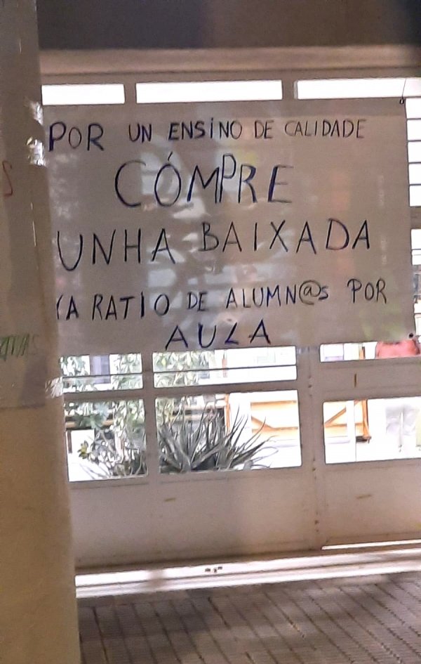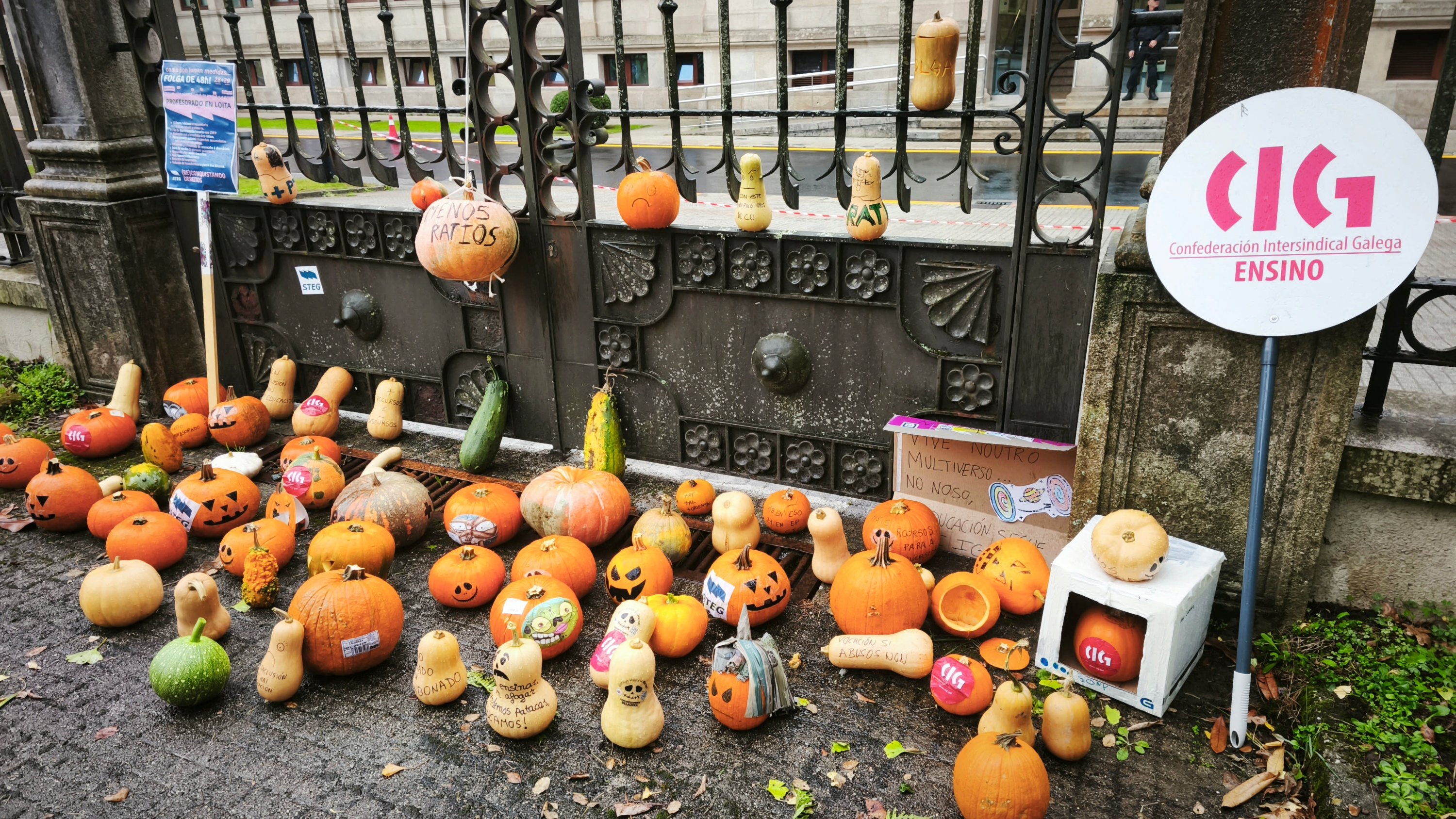 Durante a protesta moitas persoas portaron cabazas que se depositaron xusto diante da fachada da Consellaría de Educación. “Trouxémoslle cabazas ao conselleiro -engadiu- porque simboliza o suspenso por parte do profesorado porque non sabe sumar cando di que medio docente máis medio docente son dous docentes, suspende tamén na atención á diversidade ao pretender que unha persoa orientadora atenda a máis de 300 rapaces ou rapazas ou non dota os centros con especialistas de Pedagoxía Terapéutica e Audición e Linguaxe, cando non sabe colocar no mapa os coles do rural porque os deixa abandonados ou en lingua galega por someter ao ostracismo á nosa lingua”.