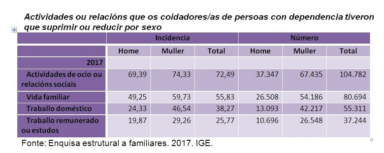 No ano 2017, o 19,8% dos homes coidadores tiveron que reducir ou suprimir actividades remuneradas. No caso das mulleres esta porcentaxe foi do 29,2%, 10 puntos máis.