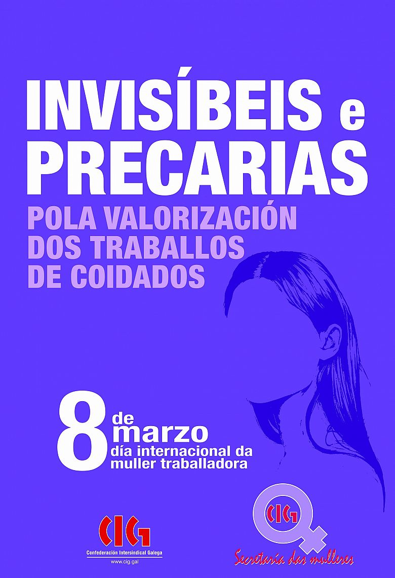 Ante estes datos que evidencian de forma abrumadora que as mulleres seguen a responsabilizarse dos traballos de coidados, a secretaría das Mulleres da CIG acordou centrar a campaña do 8 de marzo deste ano precisamente nesta cuestión, baixo o lema “Invisíbeis e Precarias. Pola valorización dos traballos de coidados”.