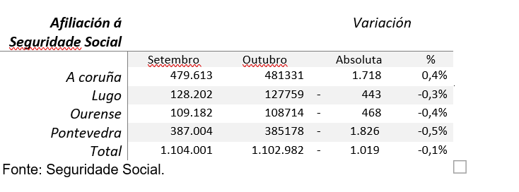 Esta caída da afiliación contrasta co leve incremento do número de persoas anotadas no desemprego, que aumentou un 0,3% con respecto ao mes de setembro, acadando as 113.386 persoas.