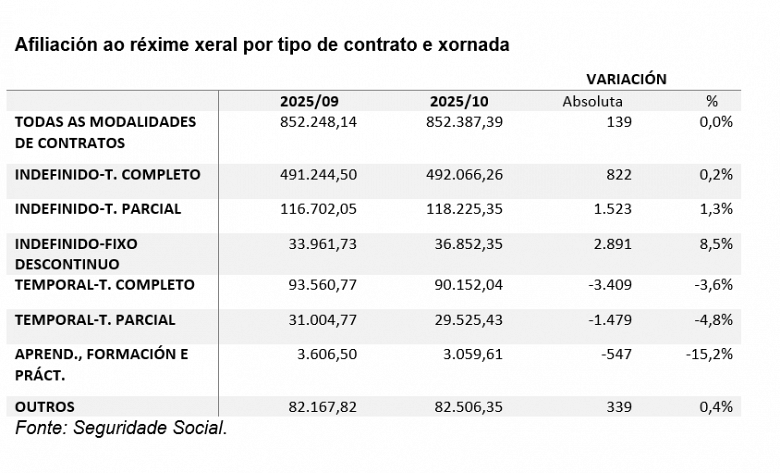 Segundo tipo de contrato e xornada, o maior incremento da afiliación prodúcese entre as persoas con contrato fixo descontinuo, ao rexistrarse un 8,5% máis que no mes de setembro. Tamén aumentan os contratos indefinidos a tempo parcial mentres que a contratación temporal, con independencia da xornada, descende. Unha circunstancia ligada á caída da afiliación no comercio e a hostalería, onde abundan este tipo de contratos precarios.