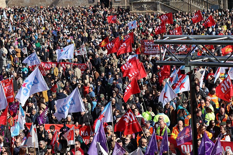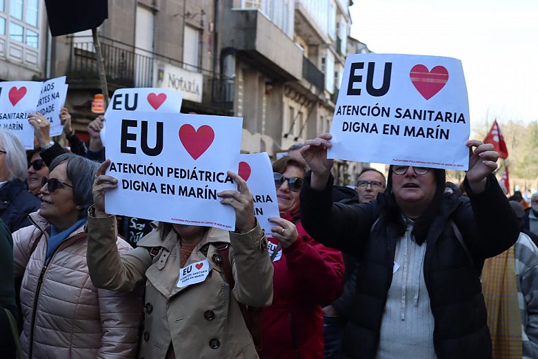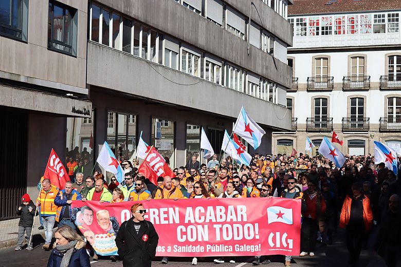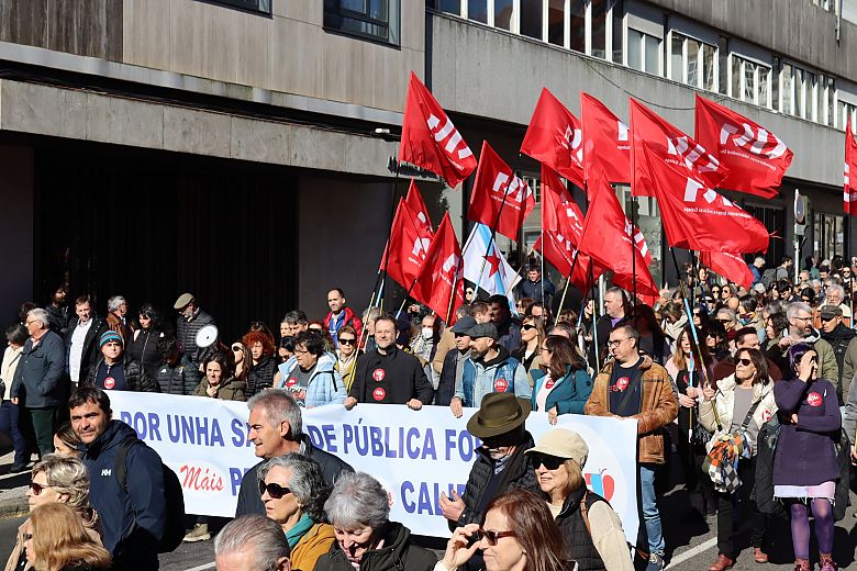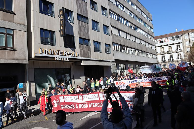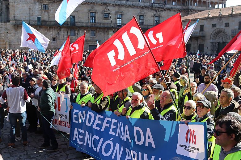 A praza do Obradoiro quedou pequena para acoller ás miles de persoas chegadas de toda Galiza para defender a sanidade pública e reclamar unha atención primaria digna. Homes e mulleres que conforman a morea de plataformas locais de SOS Sanidade Pública que se foron creando en cidades e vilas; familias ao completo para demandar desde atención pediátrica para as crianzas, até médicas e médicos abondo nos centros de saúde para que se reduzan as esperas para ter unha cita; veciños e veciñas que exixiron recuperar os seus centros de saúde e persoal para denunciar a saturación e a falta de tempo e medios para garantir unha atención digna.