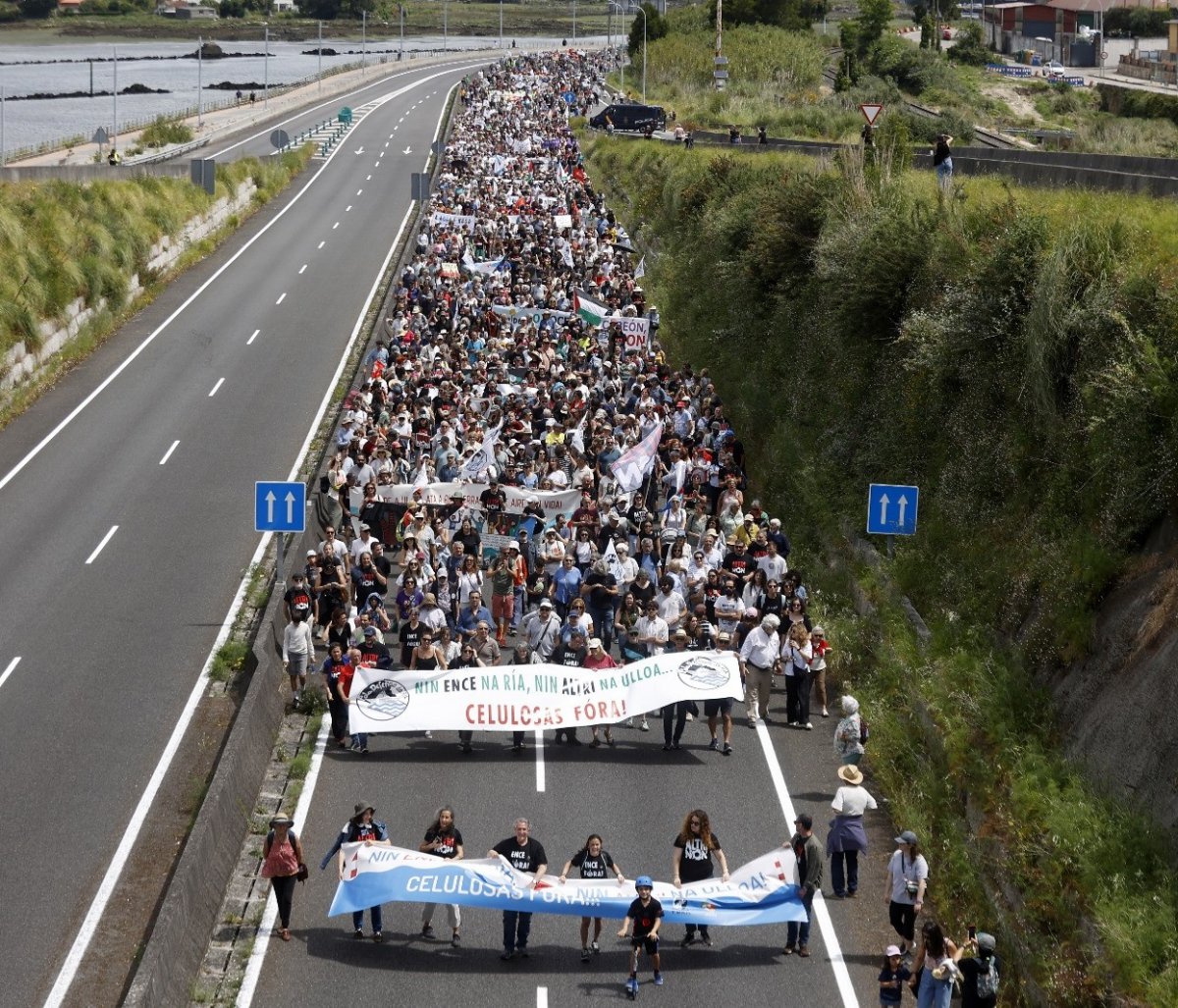 A manifestación arrincou pasado o mediodía de xeito simultáneo dende as alamedas pontevedresa e marinense baixo o lema ´Nin Ence na ría, nin Altri na Ulloa. Celulosas fóra!’ e rematou diante da pasteira en Lourizán, onde se reclamou un modelo de desenvolvemento sostíbel para Galiza e se denunciou a política de depredación do país que está a levar a cabo o PP e o modelo colonial de espoliación dos nosos recursos que representan estes dous proxectos e outros como o da mina de Touro.