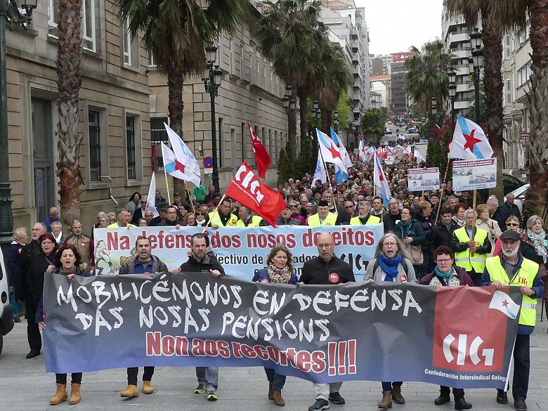 Milleiros de persoas mobilizáronse coa CIG este domingo nas 23 manifestacións e concentracións convocadas pola central sindical ao longo de todo o país en defensa do sistema público de pensións e para esixir a recuperación dos dereitos laborais e sociais roubados baixo o pretexto da crise económica. Unha recuperación que pasa pola derrogación das reformas das pensións, laborais e da negociación colectiva, como única alternativa para frear a pobreza e a precariedade que está xeneralizándose e asentándose de maneira alarmante.