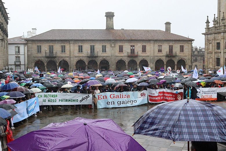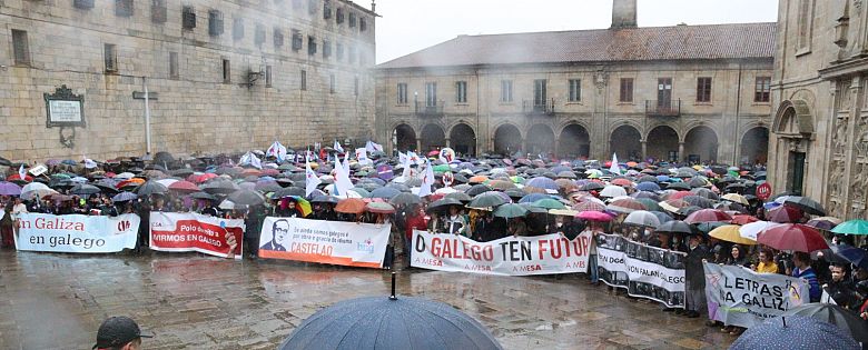 Baixo unha intensa e persistente choiva, milleiros de persoas tomaron as rúas de Compostela para celebrar o Día das Letras Galegas mais tamén para reivindicar “un novo futuro para a lingua” e reclamar o dereito a vivir en galego “agora e sempre”. A manifestación partiu da Alameda compostelá e rematou na praza da Quintana. Un percorrido no que as e os manifestantes proclamaron, máis unha vez: “Na Galiza, en galego”.