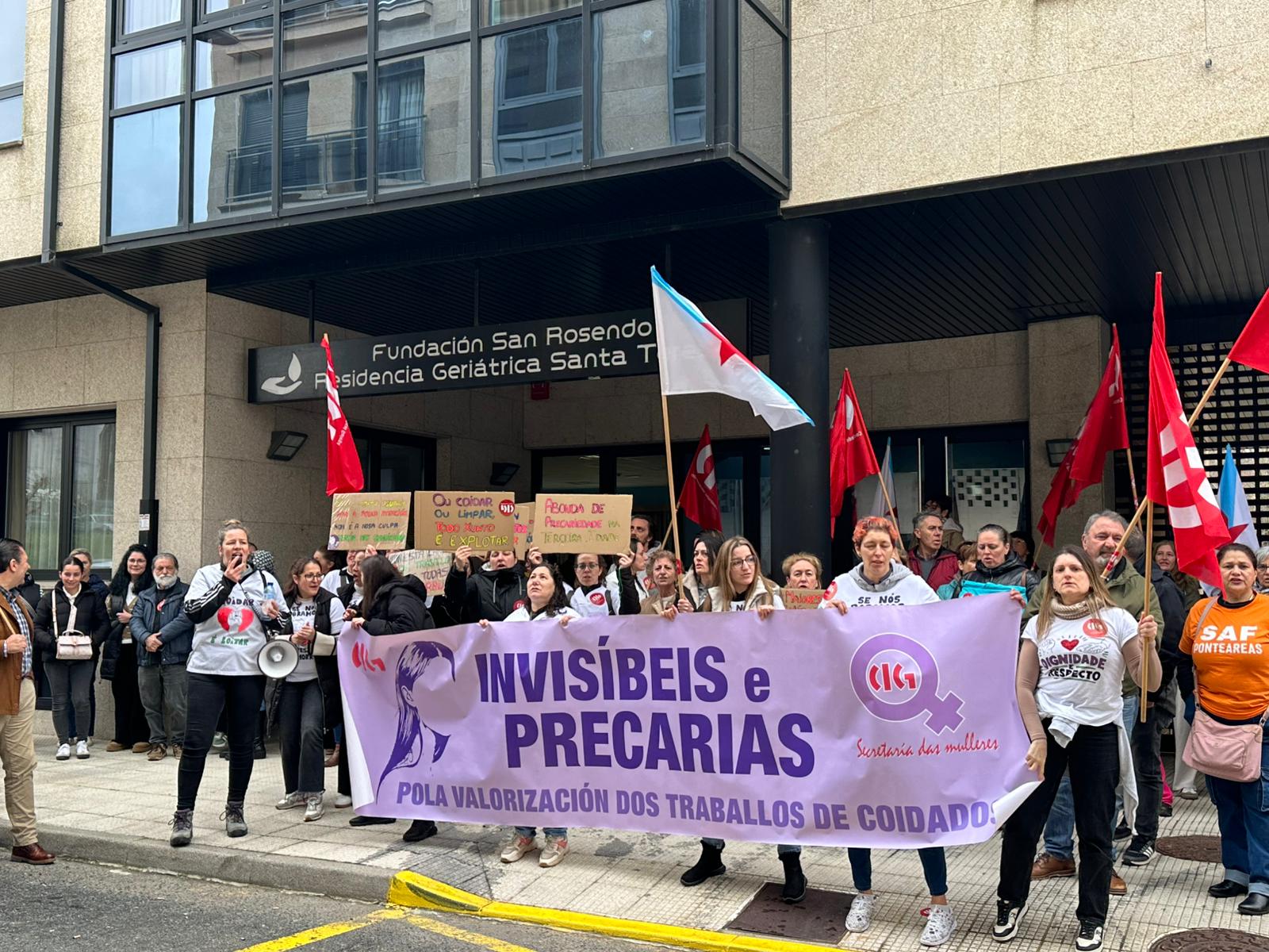 Persoas traballadoras da Residencia Geriátrica Santa Teresa da Cañiza mobilizáronse hoxe diante do centro de maiores xunto a delegadas da CIG no sector de coidados para reclamar a dignificación das súas condicións laborais, máis persoal e unha mellora das instalacións que redunde na mellora da atención e das condicións de vida das persoas usuarias.