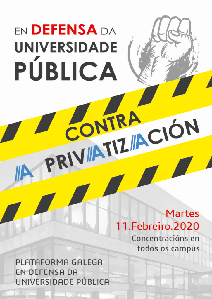 Esta martes presentábase oficialmente a Plataforma Galega en Defensa da Universidade Pública. Unha iniciativa que nace após a decisión da Xunta de Galiza de darlle o visto bo á intención da corporación Abanca de crear a primeira universidade privada de Galiza. A falta de que o Parlamento galego aprobe a Lei que permita a creación desta nova universidade, todo indica que o Goberno de Feixoo deixará ben atada esta cuestión antes de que remate a lexislatura. Por iso, no acto de presentación, xa se anunciaron concentracións en todos os campus universitarios para o próximo 11 de febreiro.