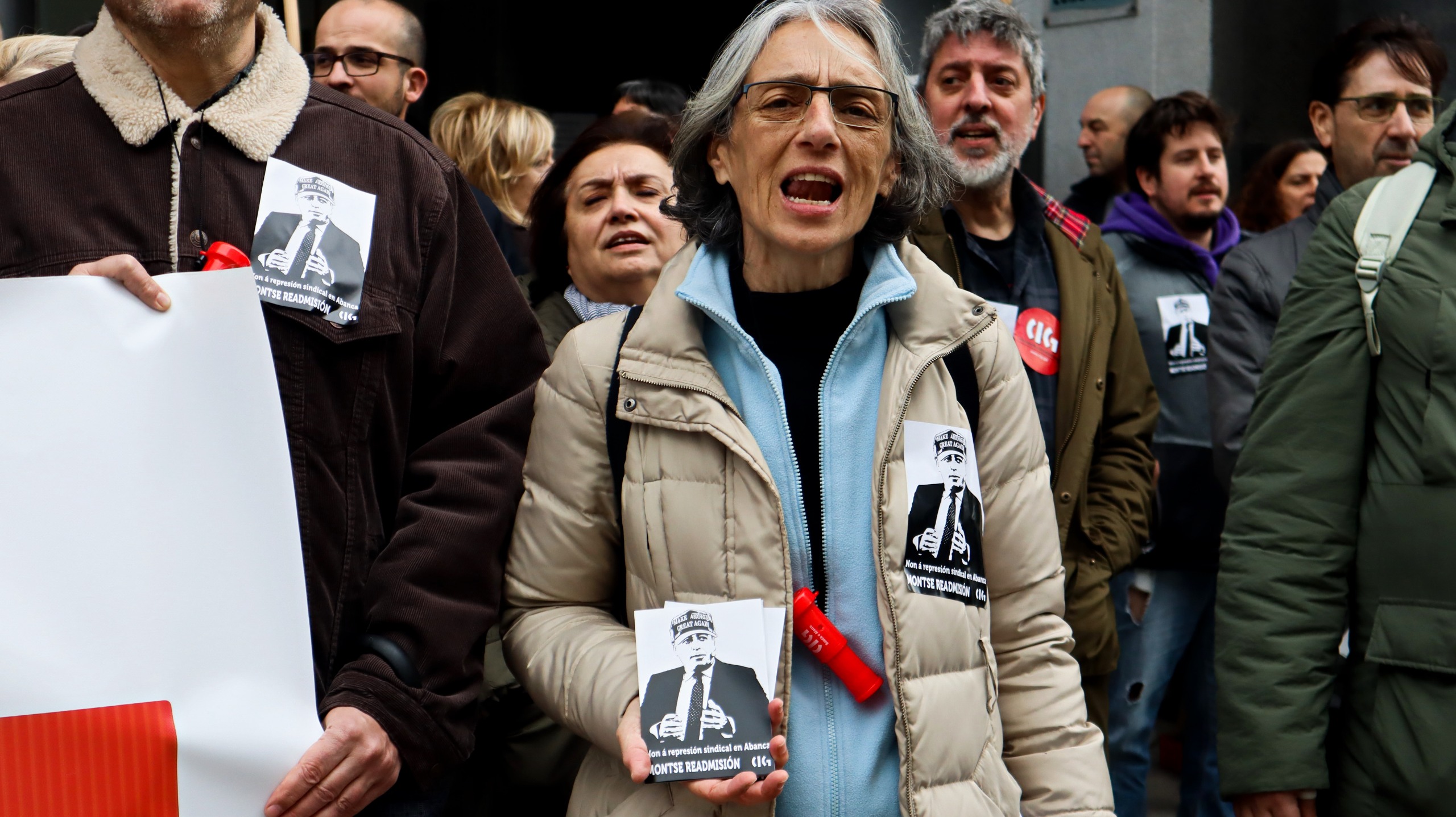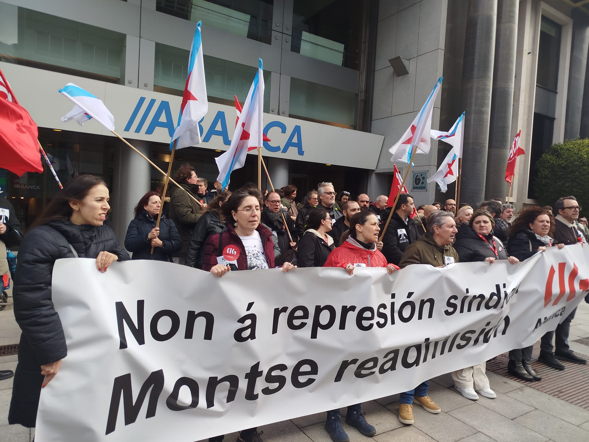 A protesta tivo lugar de 11:30 a 12:30 horas no exterior das instalacións centrais do banco ao berro de “Non é un despido, é unha cacería”, “Montse readmisión, Abanca represión” e “Represión sindical, terrorismo patronal” para rexeitar un proceso contra a empregada “propio dos tempos da Inquisición” xa que a compañeira “non puido coñecer nin os feitos concretos que se lle imputaron, colocándoa nunha clara situación de indefensión”, tal e como sinalan dende a central sindical.