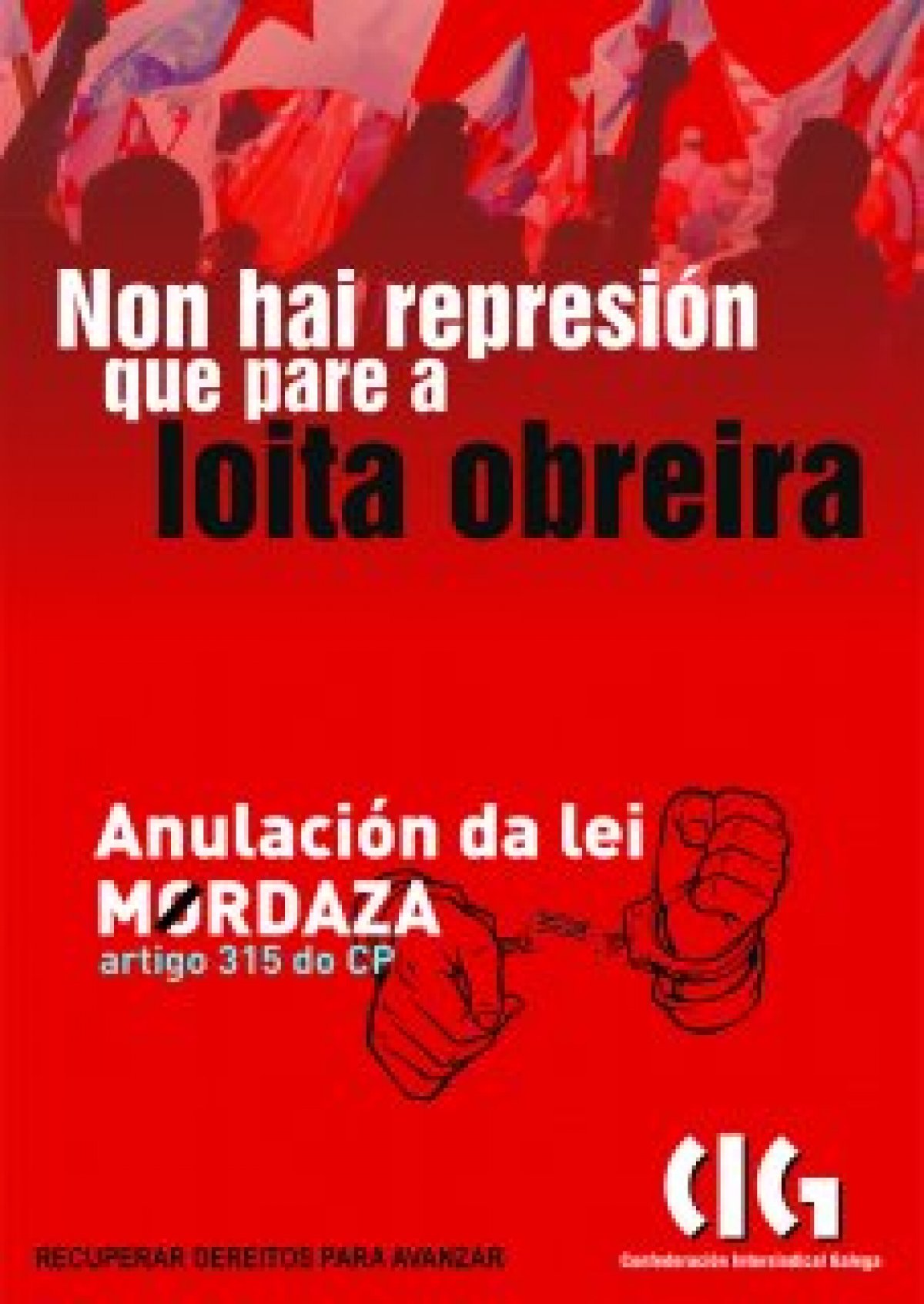 Pero na CIG non nos arredamos. Denunciamos o intento de someternos utilizando o sistema xudicial contra quen cometeu o único delito de defender os seus dereitos. Chamamos á mobilización contra quen nos quere seguir roubando e pretende castigarnos por defender o que é noso e apelamos a todas as compañeiras e compañeiros a exixir a derrogación das reformas laborais, da reforma da negociación colectiva, da Lei Mordaza e do artigo 315.3, contra as que nin sequera as pretendidas esquerdas españolas moveron un dedo.