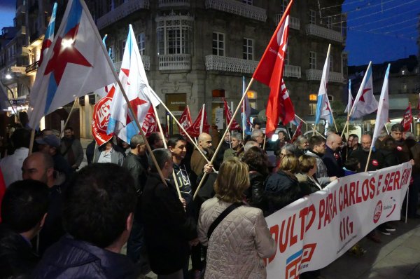 Arredor dun cento de persoas volveron amosar hoxe en Vigo a súa solidariedade con Carlos Rivas e Serafín Rodríguez, os dous traballadores condenados a tres anos de cadea pola súa participación na folga provincial do transporte en 2008. Os asistentes á concentración celebrada esta tarde na cidade reclamaron a berros a concesión dun indulto que evitaría a súa entrada en prisión. “Non son ladróns, son traballadores!”, “A represión non é a solución” e “Indulto xa!” foron de novo as consignas máis coreadas durante unha mobilización que se desenvolveu a carón da farola de Urzaiz de 19.30 a 20.00 horas.