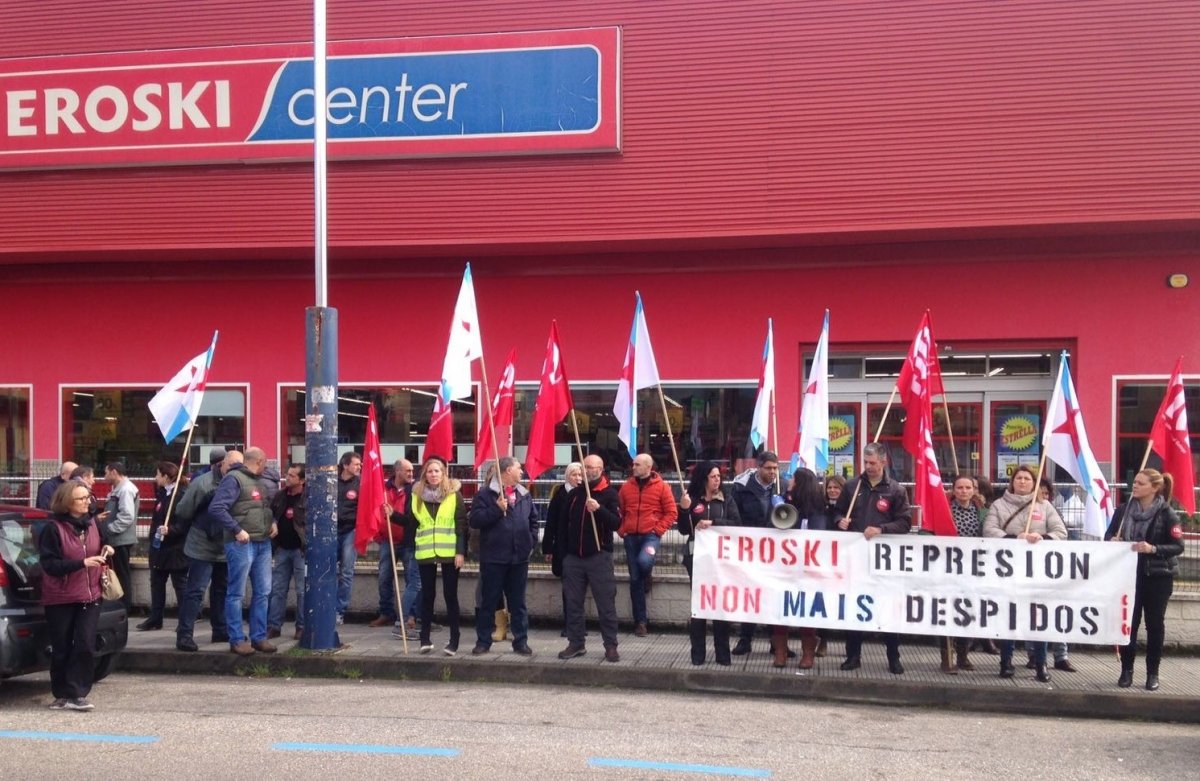 A CIG-Servizos desenvolveu hoxe unha nova mobilización contra a vaga de despedimentos no grupo Eroski en Vigo. Un grupo de traballadores/as e delegados/as sindicais da central concentrouse nesta ocasión ás portas dun supermercado da empresa vasca de distibución en Mos, onde despregaron unha faixa e berraron consignas contra a represión laboral.