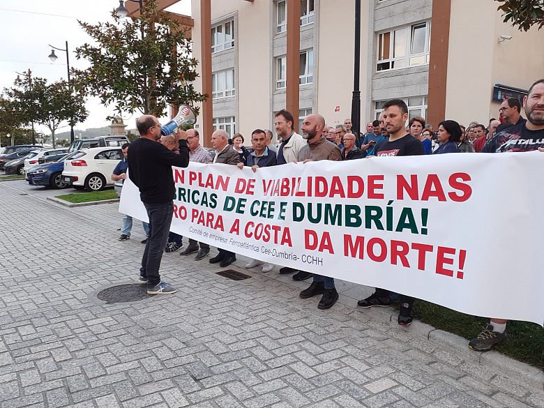Como cada martes dende hai tres semanas, traballadores e traballadoras de Ferroatlántica concentráronse diante da casa do concello de Cee para manifestar o seu rexeitamento a operación de venda do complexo industrial e enerxético ao fondo norteamericano TPG Sixth Street Partners e reclamar da Xunta de Galiza que esixa o preceptivo plan de viabilidade a empresa, tal e como obrigan as cláusulas concesionais.