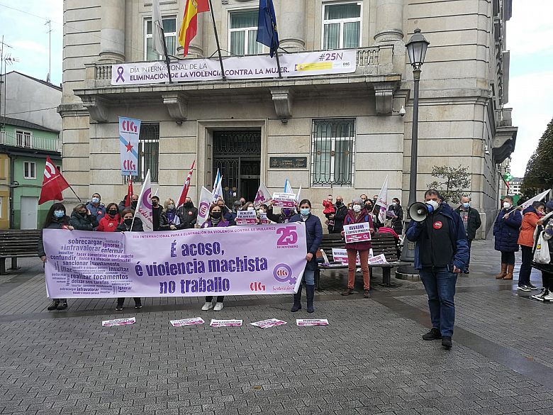 A secretaría das mulleres da CIG desenvolveu esta mañá concentracións en nove localidades galegas para denunciar o acoso que sofren as mulleres no ámbito laboral. Celebrou ademais asembleas en todas as comarcas para abordar este tema que centra a campaña que, baixo o lema “ É acoso, é violencia machista no traballo”, desenvolve a central sindical arredor do Día Internacional para a Eliminación da Violencia contra as Mulleres.