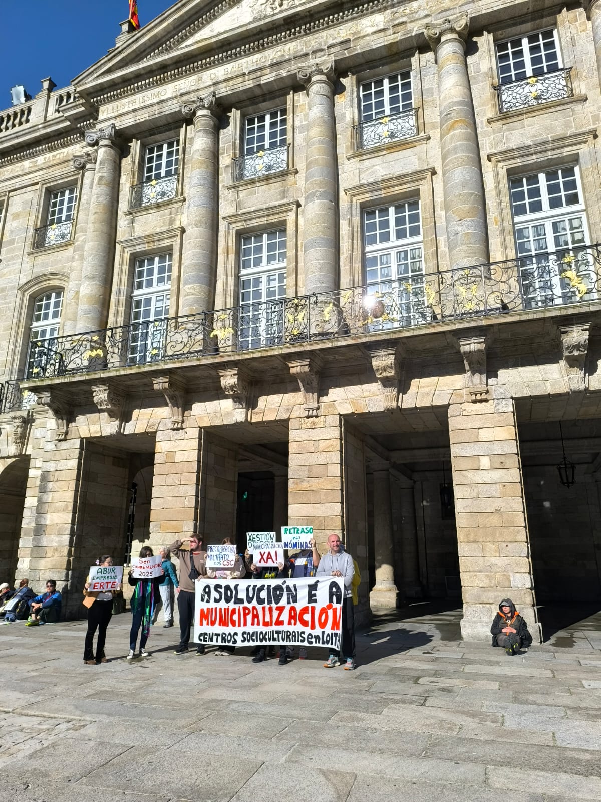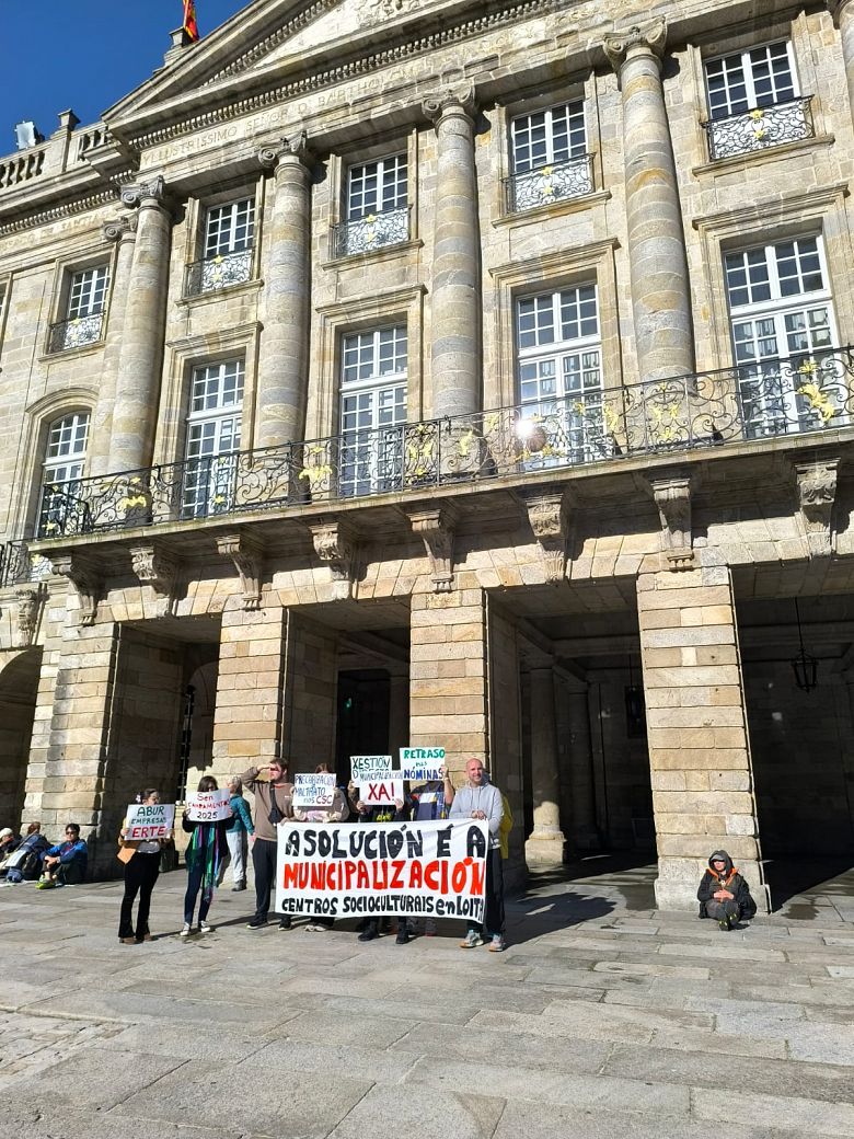 O Comité de Empresa dos Centros Socioculturais de Santiago concentrouse este xoves, 24 de abril, diante do Pazo de Raxoi durante o pleno municipal para denunciar a "situación de abandono" á que está abocada a Rede de Centros Socioculturais, sen solucións á vista. O persoal alerta dunha crise agravada desde febreiro, cando a empresa dos Lotes I e IV (Serviplus) anunciou a súa marcha prematura, deixando o servizo nunha situación "cada vez máis inestable".