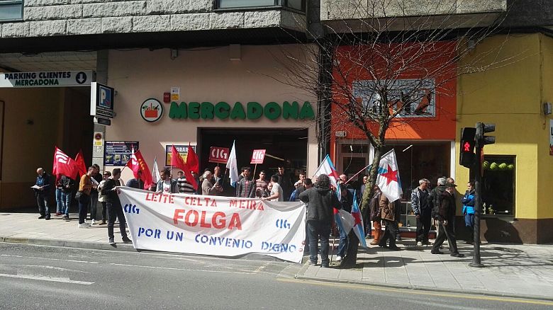 O persoal de Leche Celta, en folga indefinida dende o pasado xoves, levou este martes a súa loita por un convenio digno até o supermercado que Mercadona ten na Avenida da Coruña en Lugo, xa que esta empresa é a única cliente da factoría de Meira. Durante a concentración, os traballadores e traballadoras repartiron información sobre o conflito entre a clientela, denunciando que Leche Celta contribúe "a non eliminar as diferenzas salariais entre o seu persoal e con isto, ao mantemento da precariedade laboral na nosa terra".