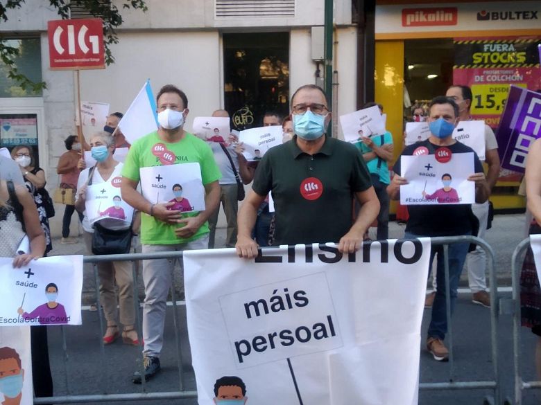 Con proclamas como “Sen saúde non hai educación” ou “Ensino presencial e con seguridade”, delegadas e delegados do ensino público reclamaron na tarde deste xoves que a Consellaría de Educación sente falar coa representación do profesorado e rectifique as cuestións máis lesivas do protocolo da Covid19. A protesta realizouse diante do Parlamento galego aproveitando a votación de investidura de Feijóo como presidente da Xunta e constitúe a antesala da folga que a CIG-Ensino e o resto de organizacións sindicais teñen convocada para os días 10 e 16 de setembro, datas nas que comeza o curso nas distintas etapas educativas.